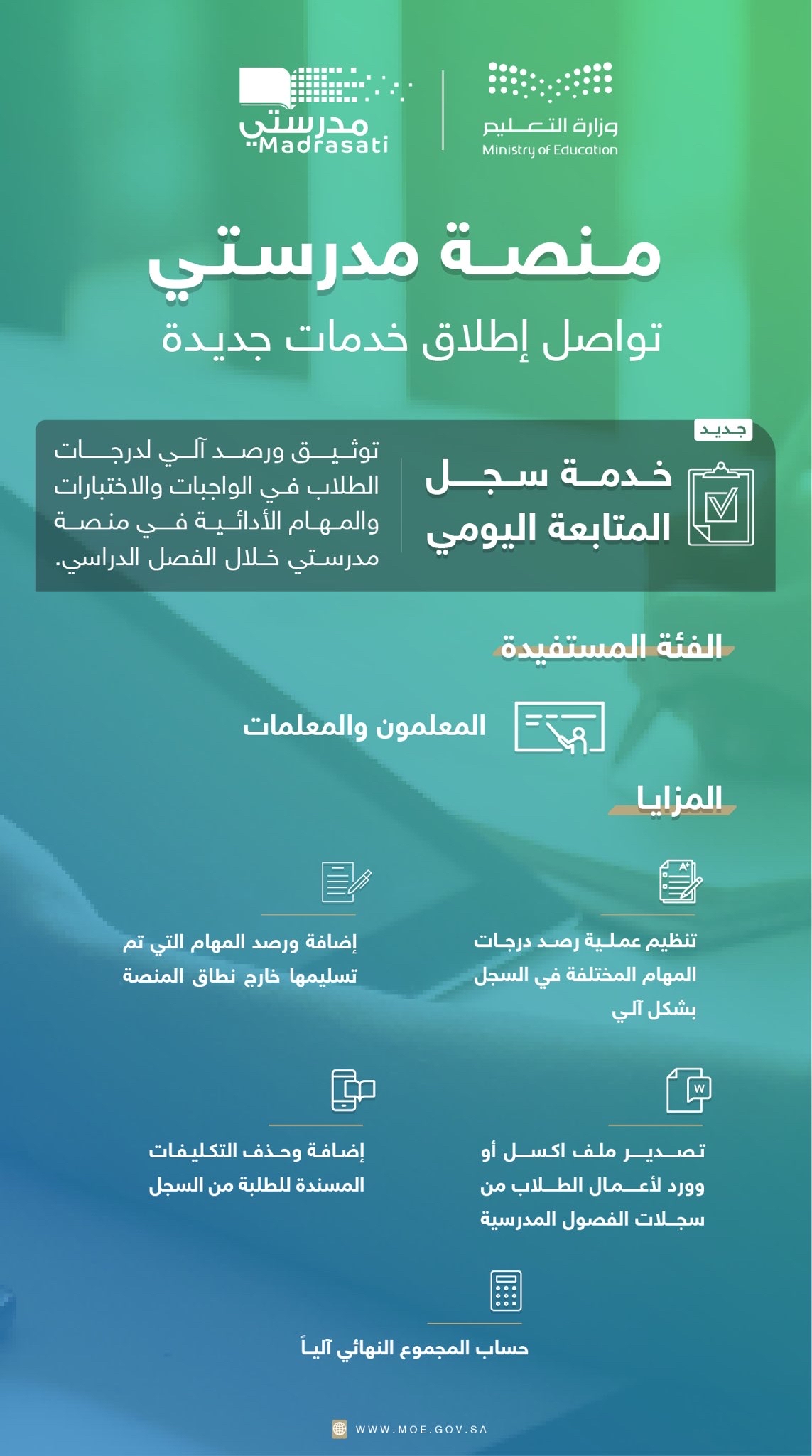 أعلنت منصة ”مدرستي“، التابعة لوزارة التعليم، عن إطلاق خدمة جديدة تحمل اسم ”سجل المتابعة اليومي“، وذلك بهدف رصد وتوثيق درجات الطلاب والطالبات خلال الفصل الدراسي.