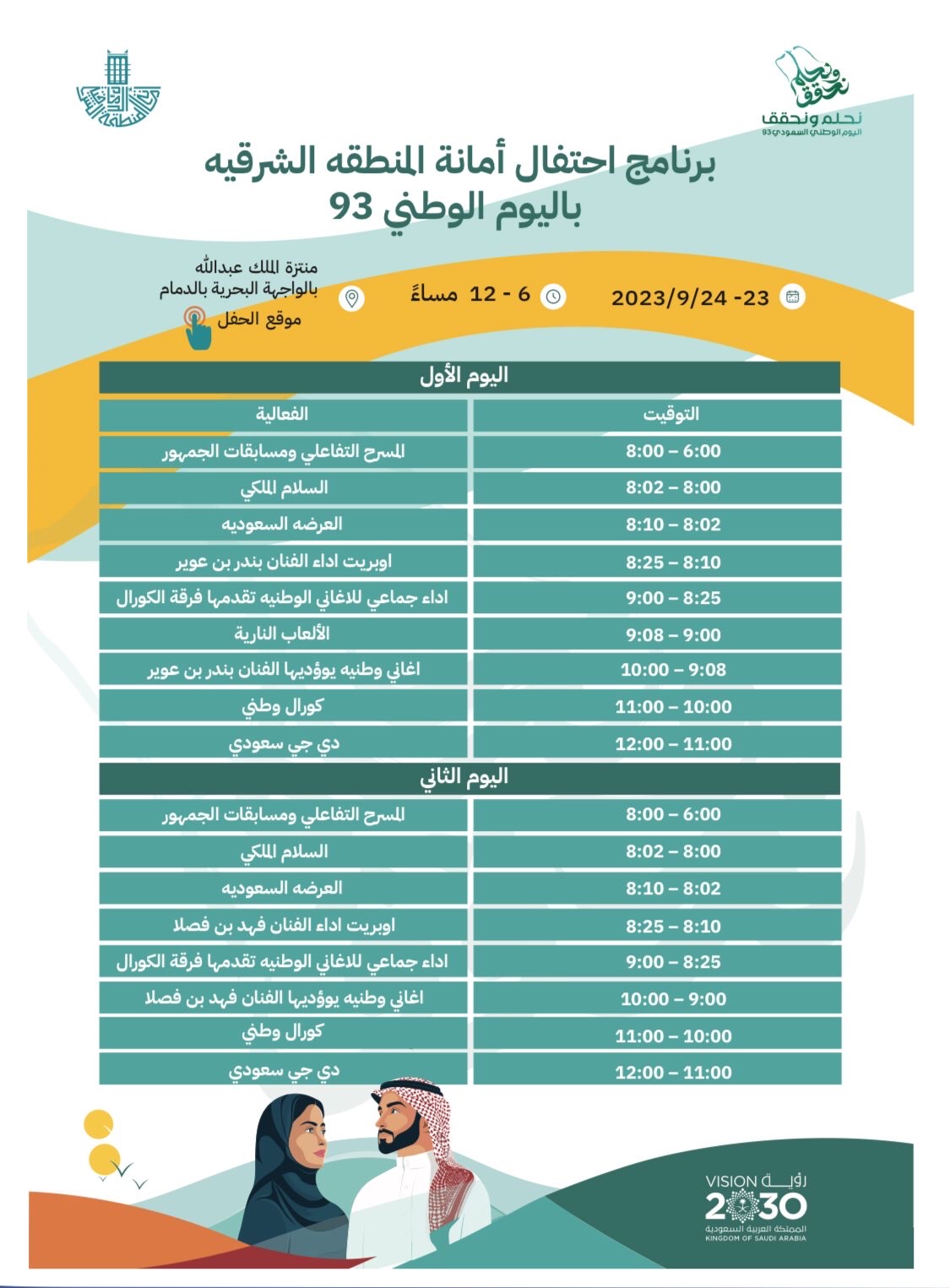 وقالت الأمانة: إن برنامج الحفل في يومي السبت والأحد الموافق 23-24- سبتمبر -2023م. بمنتزه الملك عبد الله ”الواجهة البحرية بالدمام“، اليوم الأول الألعاب النارية لمدة 8 دقائق وذلك بدءاً من الساعة التاسعة، وأوبريت وطني خاص يتضمن لوحات متنوعة ومنسجمة مع بعضها تأخذ ايقاعاتها، وكلماتها من الموروث الخاص بالمنطقة الشرقية والقيادة والوطن، والذي سيقدم أداءً جماعياً للأغاني الوطنية يقدمها مع الكورال، بالإضافة إلى أغاني وطنية.