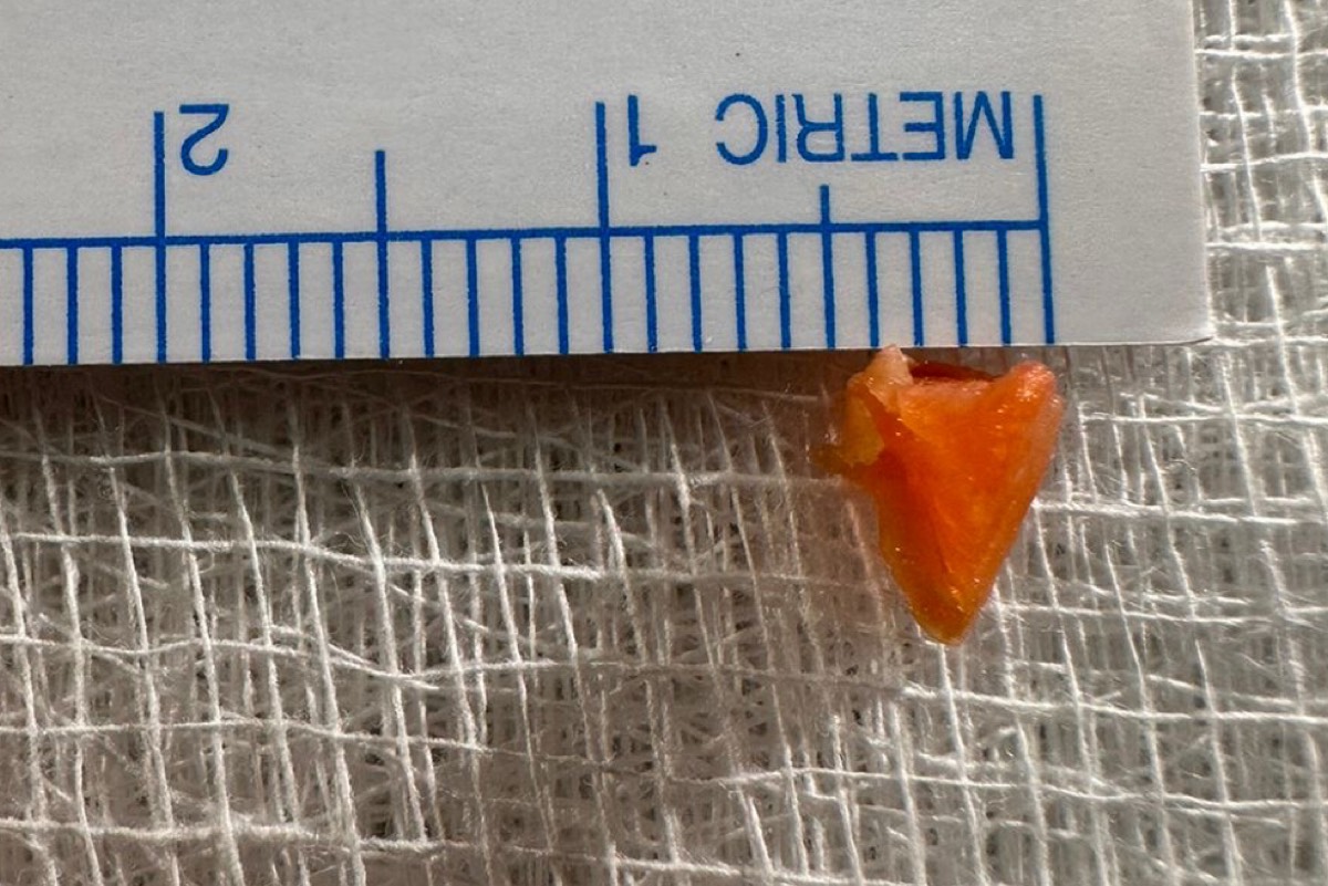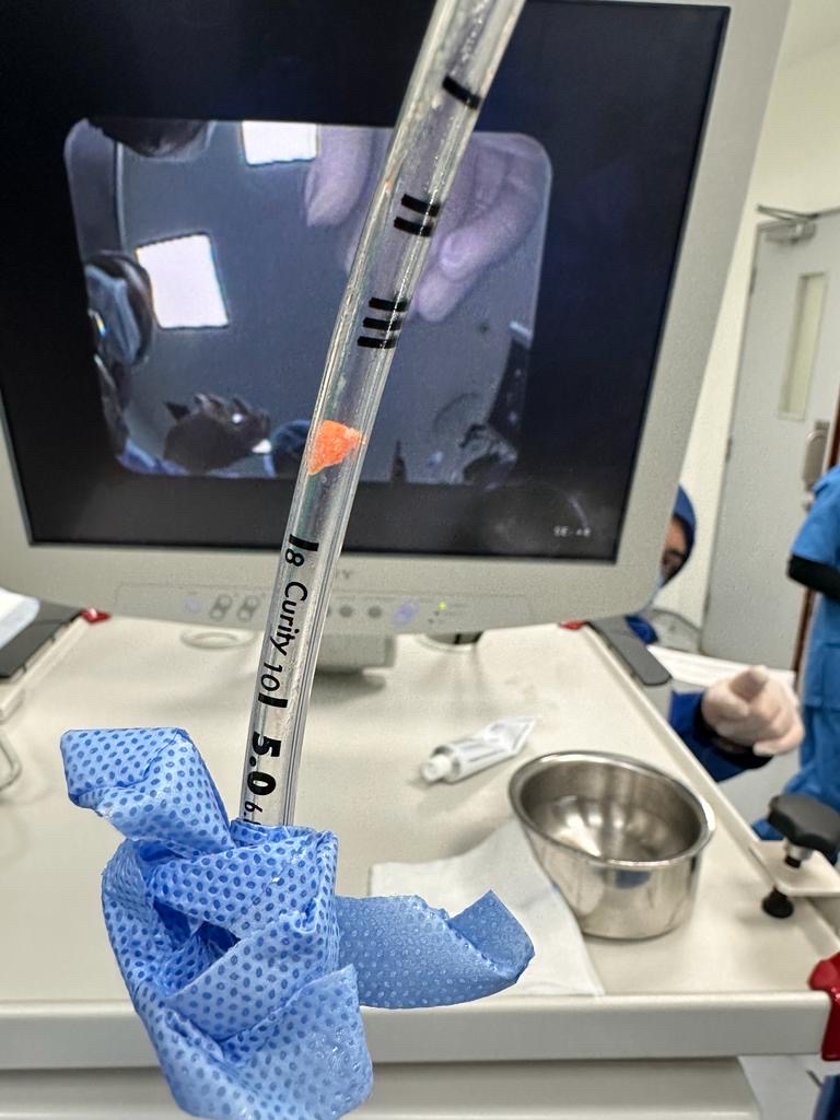 واتضح أن الجسم الغريب الذي تسبب في انسداد كامل للقصبة الهوائية اليسرى هو قطعة جزر غير مطبوخ بمقاس 6*4 ملم، وبعد استقرار حالته الصحية في العناية المركزة للأطفال، غادر المستشفى وهو بصحة جيدة.