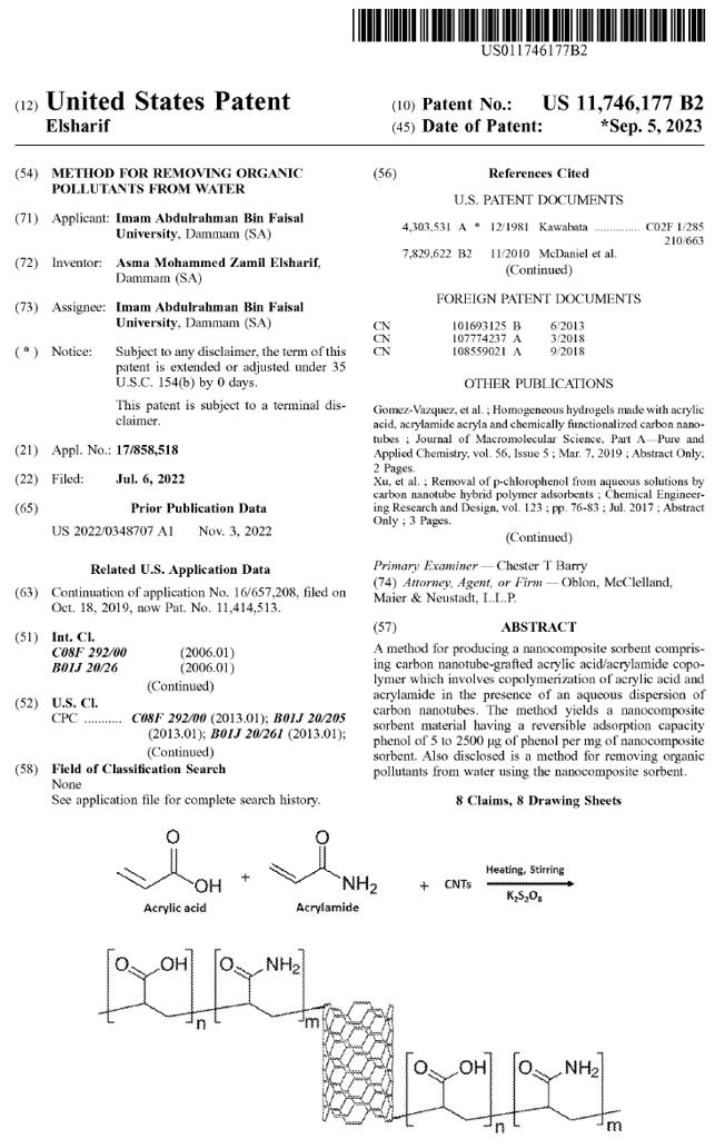 حصلت د. أسماء الشريف، من جامعة الإمام عبد الرحمن بن فيصل، على براءة اختراع لإزالة الملوثات العضوية من المياه.