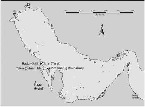 «الخريطة لشرق شبه الجزيرة العربية حيث يظهر طرق التجارة البحرية وهو مقتبس من قبل المؤلف من د. بوتس، ماجان القديمة، 128».