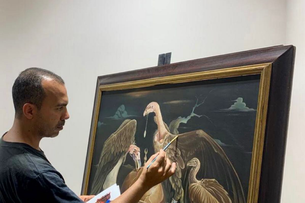 أثارت مشاعر الحزن للفنان التشكيلي حسن أبو حسين، لما تتعرض له مدينة غزة الفلسطينية، من انتهاكات بسبب هجوم الكيان الصهيوني لإعداد لوحته ”النسور الغاصبة“.