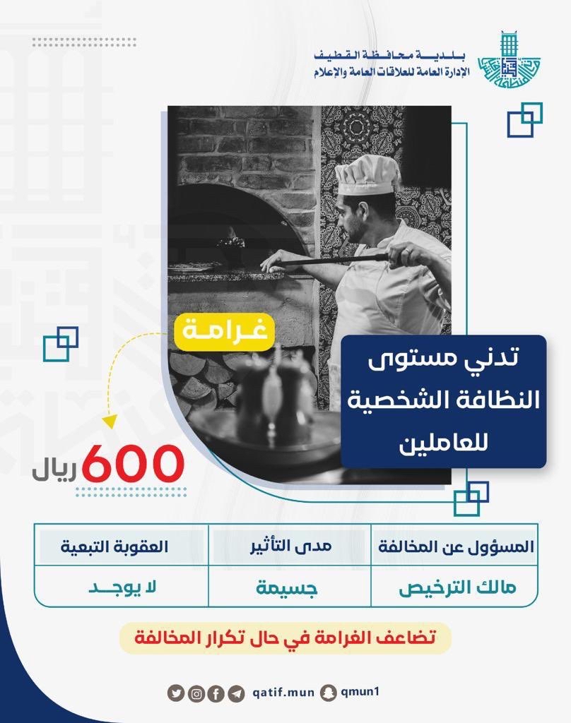 وأشارت البلدية إلى أن تدني مستوى النظافة الشخصية للعاملين تبلغ غرامتها 600 ريال، ويكون المسؤول عن المخالفة مالك الترخيص وتضاعف الغرامة في حال تكرار المخالفة.