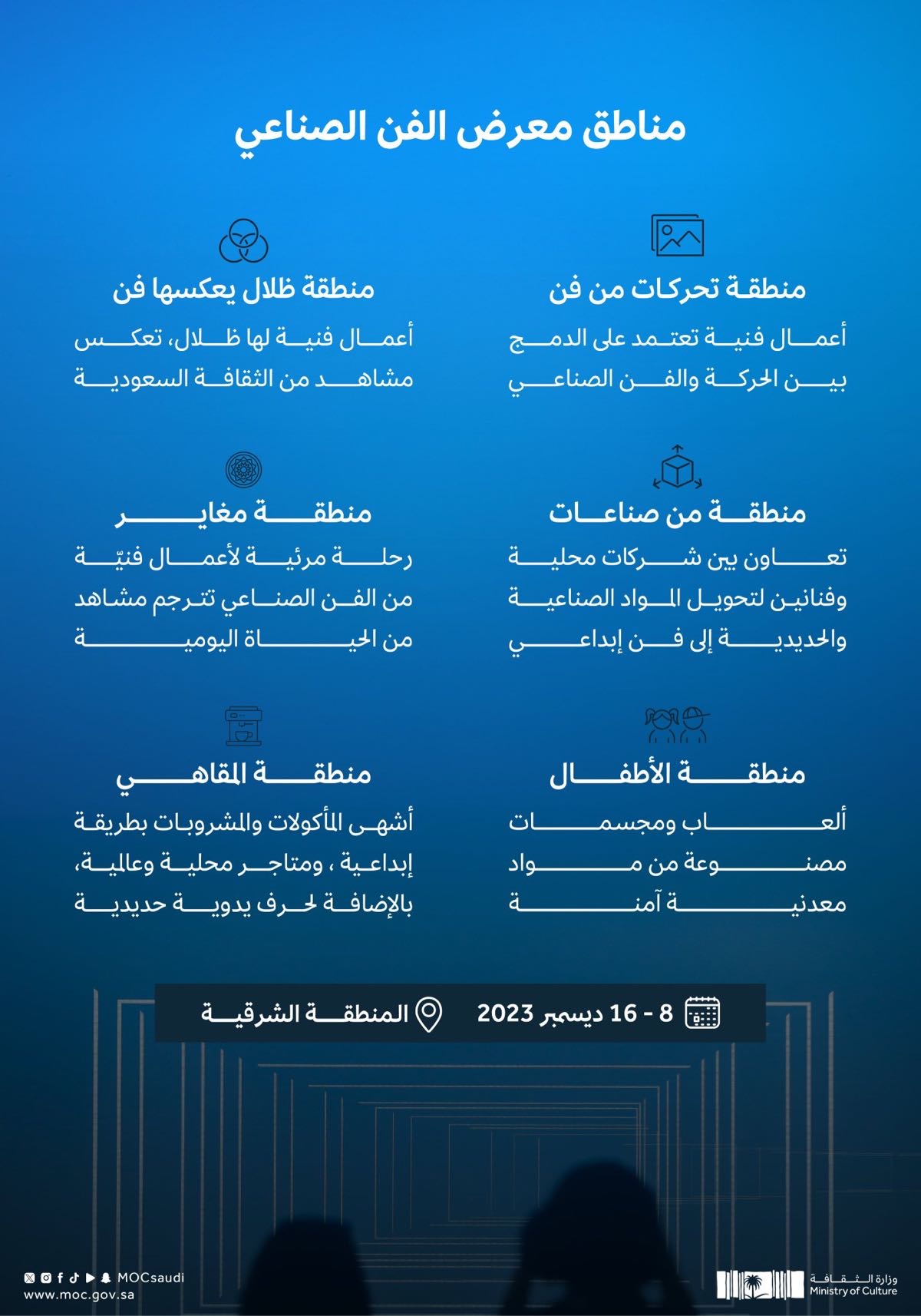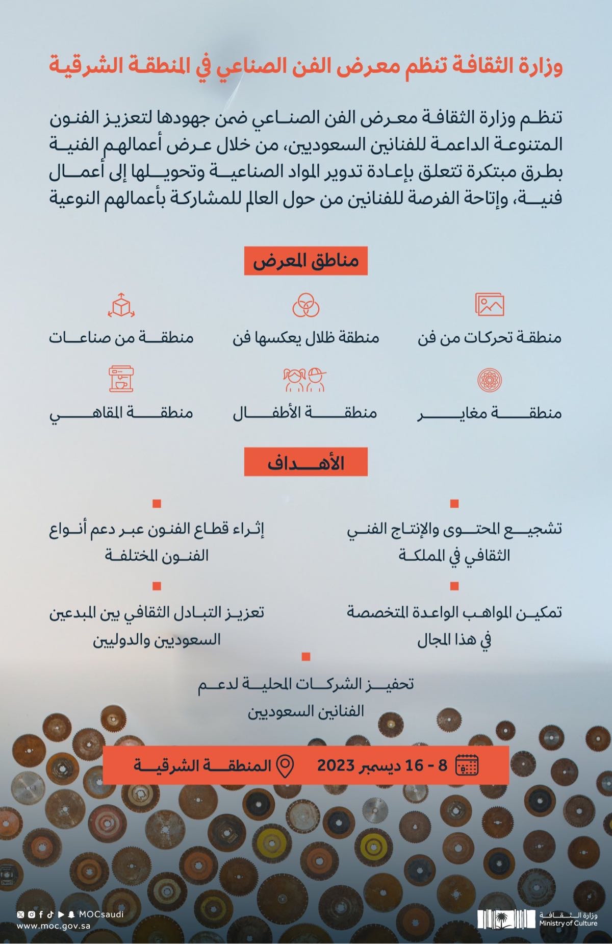 تنظم وزارة الثقافة معرض الفن الصناعي، بالمنطقة الشرقية خلال الفترة من 8 إلى 16 ديسمبر بهدف تعزيز الفنون المتنوعة الداعمة للفنانين السعوديين، وإتاحة الفرصة للفنانين من حول العالم للمشاركة.