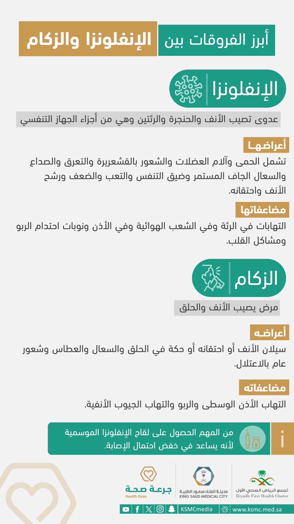 كشفت مدينة الملك سعود الطبية عن أبرز الفروقات بين الإنفلونزا الموسمية والزكام، والتي تتشابه أعراضهما بشكل كبير، لكن هناك بعض الاختلافات المهمة بينهما.