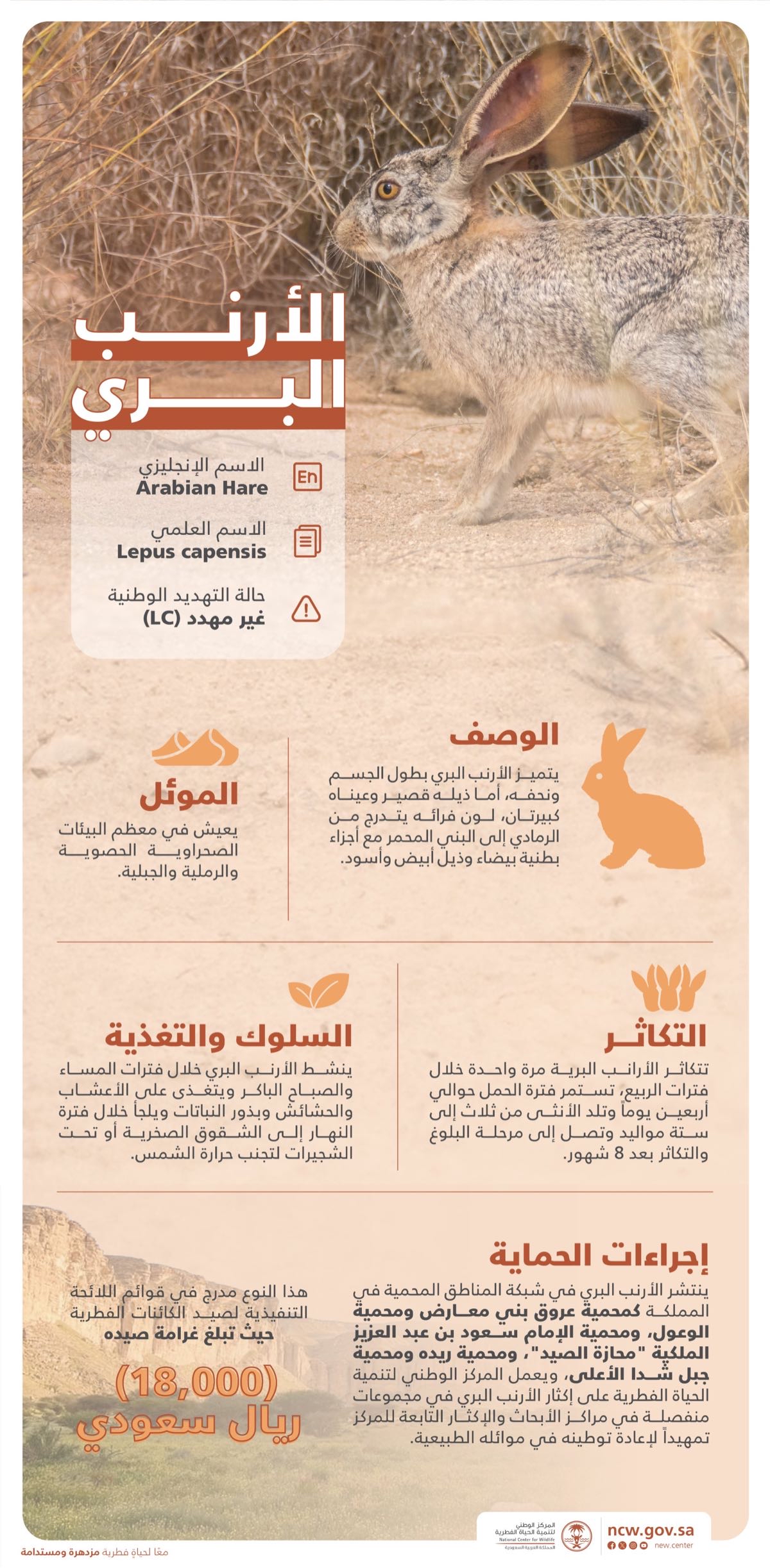 وكشف ”المركز“ في انفوجراف توعوي عبر صفحته الرسمية بمنصة ”إكس“ أن الأرانب البرية تتميز بطول الجسم ونحافته، وذيل قصير وعينين كبيرتين، ولونه فاتح يتدرج بين الرمادي إلى البني المحمر، مع أجزاء بطنية بيضاء وذيل أبيض وأسود.