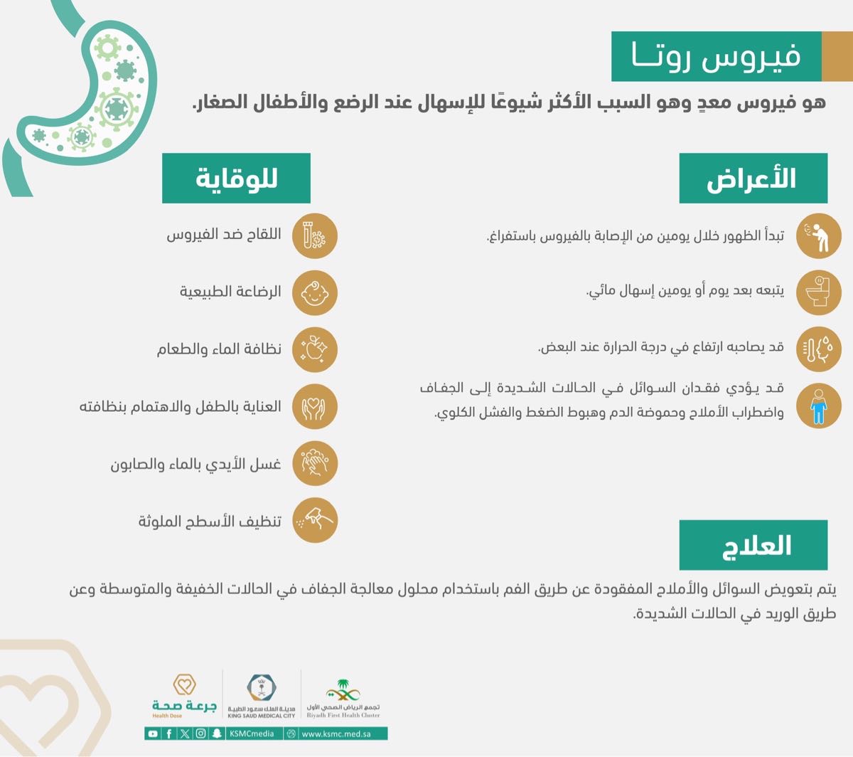 كشفت مدينة الملك سعود الطبية عن فيروس روتا الذي يُعد السبب الأكثر شيوعاً للإسهال عند الرضع والأطفال الصغار، مؤكدةً أنه فيروس معدي.