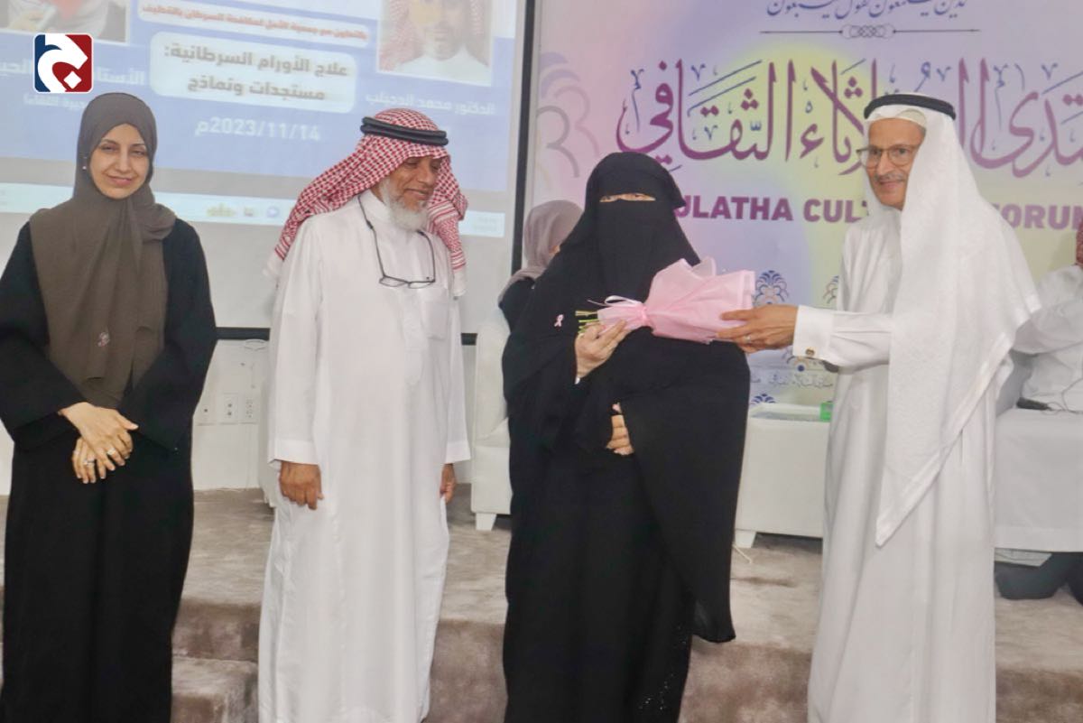 نظم منتدى الثلاثاء الثقافي، مساء أمس، ندوة توعوية تحت عنوان ”علاج الأورام السرطانية: مستجدات ونماذج“، بمشاركة استشاري جراحة الثدي والغدد الصماء بمستشفى الملك فهد التخصصي الدكتور محمد الدحيلب، وذلك بالتعاون مع جمعية الأمل لمكافحة السرطان بالقطيف، وبمشاركة ثلاثة متعافين.