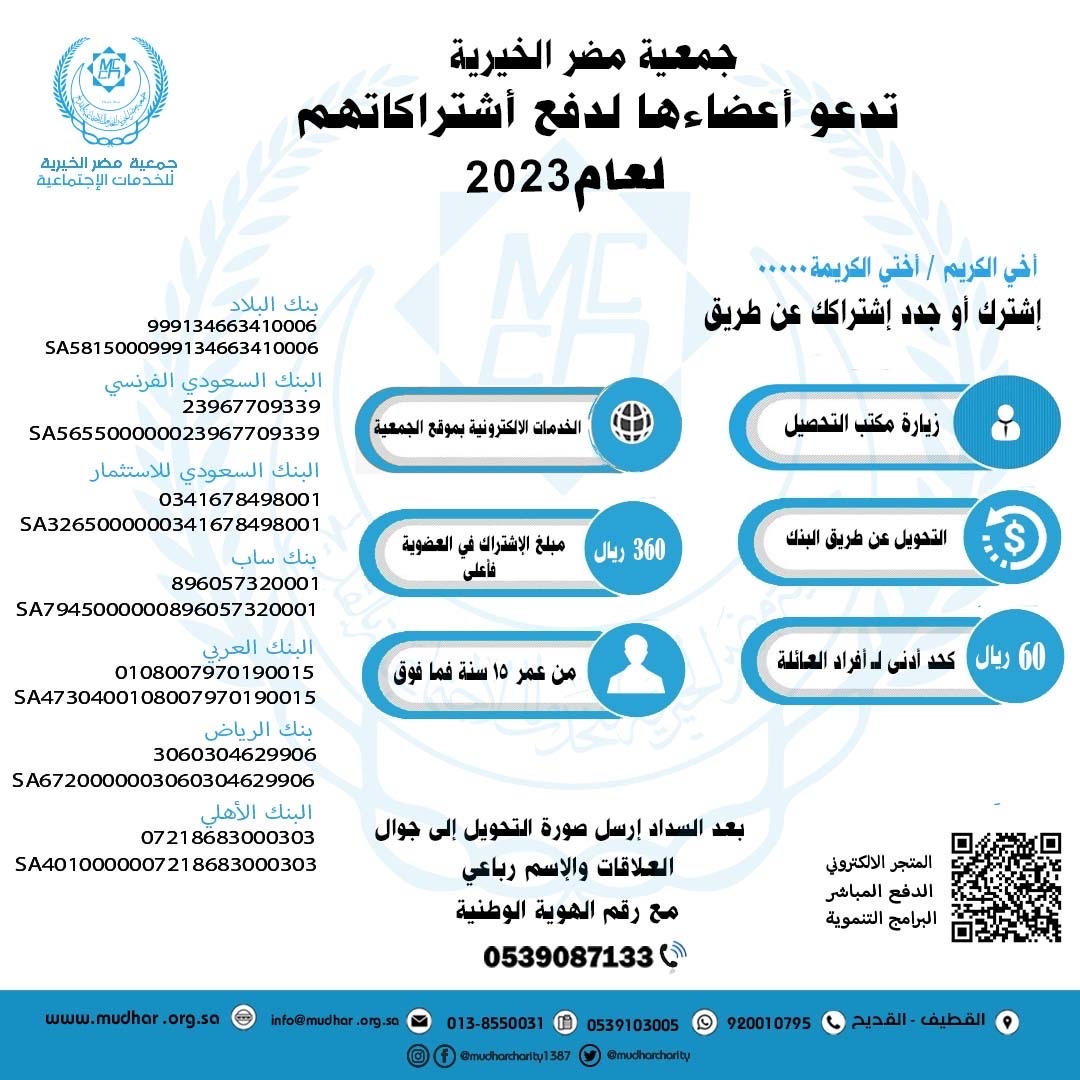 دعت جمعية مضر الخيرية بالقديح، أعضاءها، لتسديد الاشتراك السنوي قبل نهاية العام المالي 2023م.