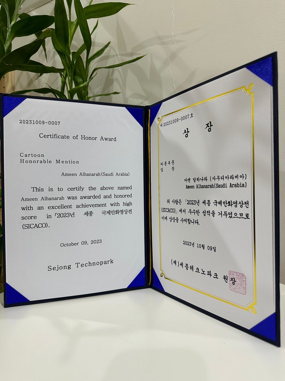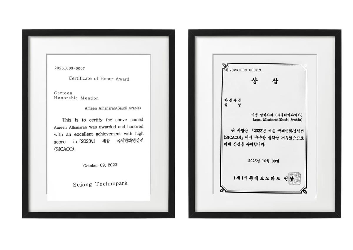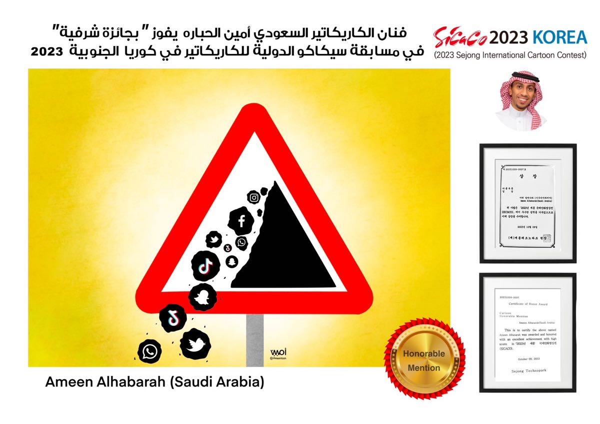 فاز فنان الكاريكاتير السعودي أمين الحباره، بجائزة مسابقة ”سيكاكو“ الدولية الثانية والثلاثين في كوريا الجنوبية 2023 للمرة الثانية، وتصور اللوحة الفائزة، التحذير من منزلق إدمان وسائل التواصل الاجتماعي.
