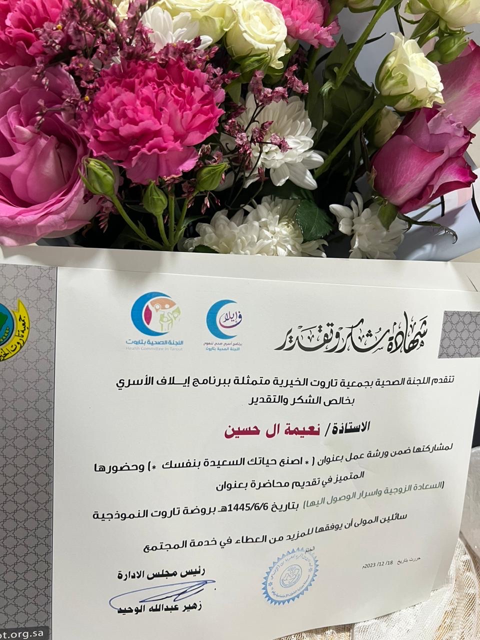 استفادت 40 سيدة، من أول ورش برنامج ”إيلاف“ الأسري، التابع للجنة الصحية بخيرية تاروت، ضمن سلسلة ”اصنع لنفسك حياة سعيدة“ للمقبلات على الزواج، على مسرح روضة تاروت النموذجية.