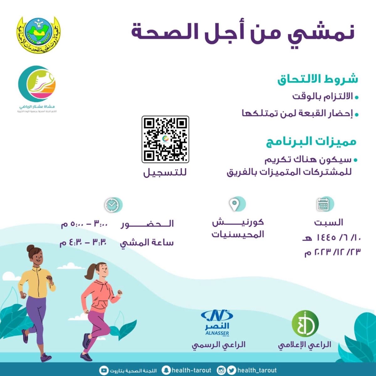 ينظم فريق عشتار الرياضي، التابع للجنة الصحية بجمعية تاروت الخيرية، فعالية مشي تحت عنوان ”نمشي لأجل الصحة“، يوم غدٍ السبت، الموافق 23 ديسمبر 2023 م، في كورنيش المحيسنيات.