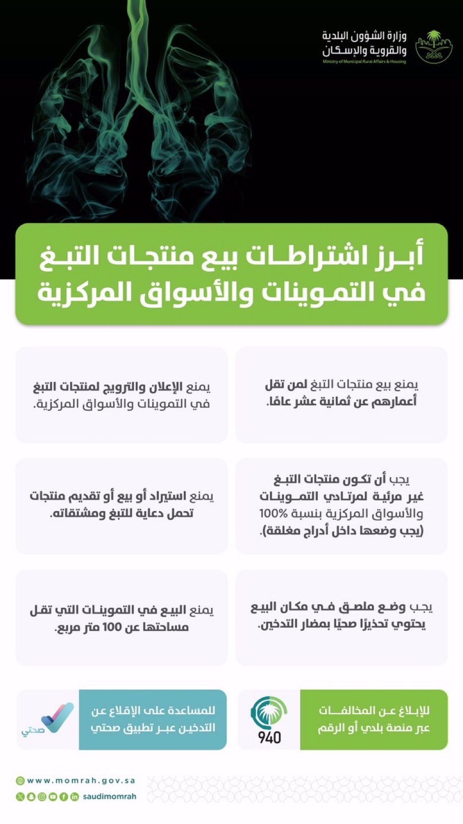 كشفت وزارة الشؤون البلدية والقروية الإسكان عن أبرز اشتراطات بيع منتجات التبغ في التموينات والأسواق المركزية.