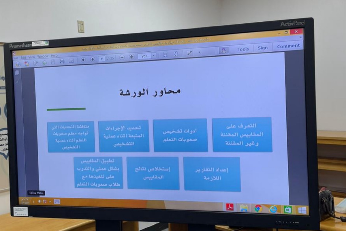 واستعرضت الورشة كيفية إعداد التقارير اللازمة واستخلاص نتائج المقاييس، وتطبيقها بشكل عملي والتدريب على تنفيذها مع طلاب صعوبات التعلم.