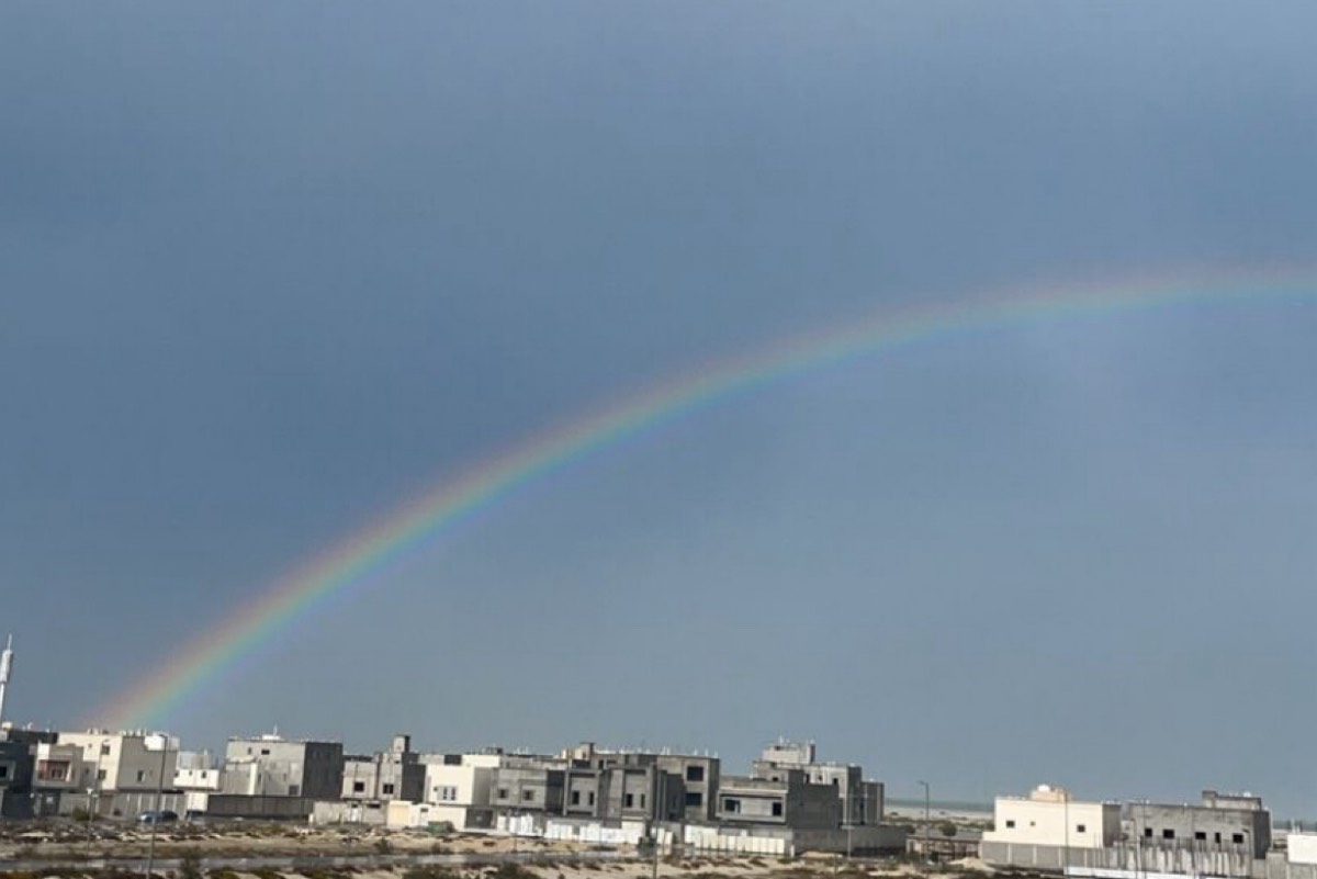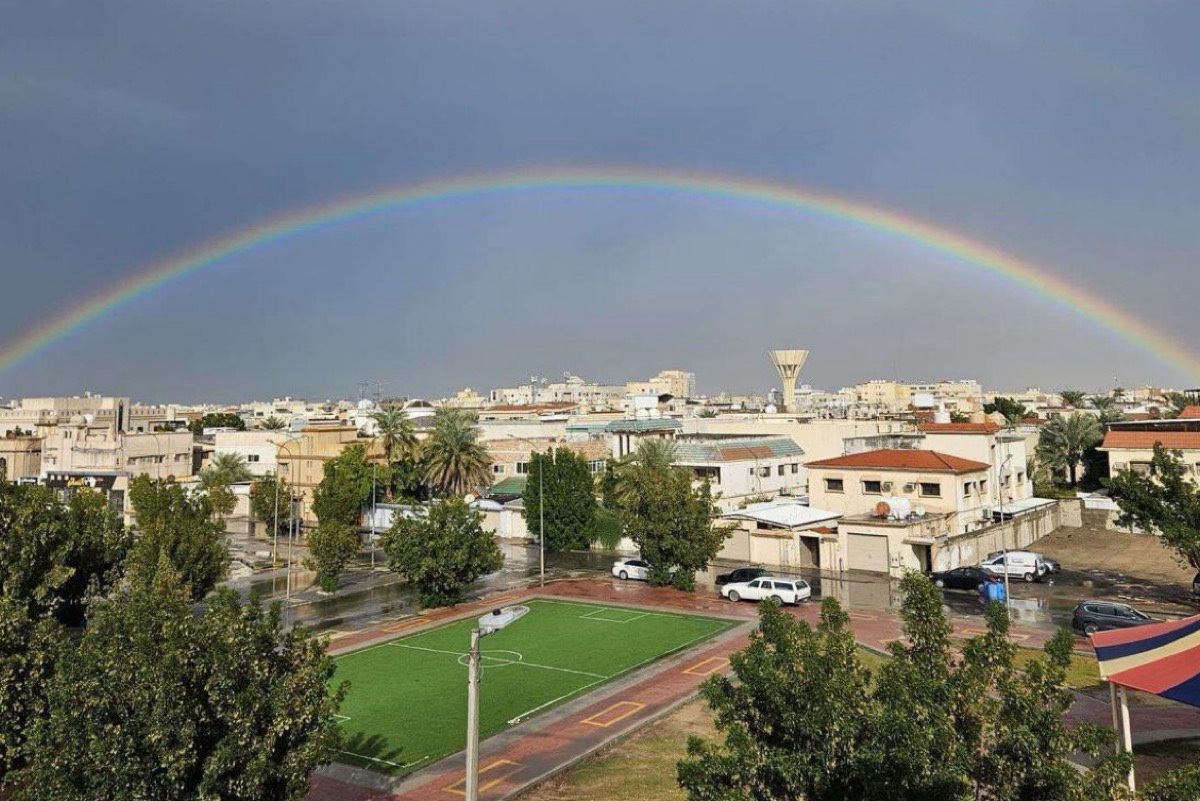 وظهر قوس قزح بألوانه السبعة الزاهية، بعد هطول أمطار غزيرة على المنطقة، حيث شكّل منظراً بديعاً ومميزاً، تناقلته الكاميرات بكثافة.