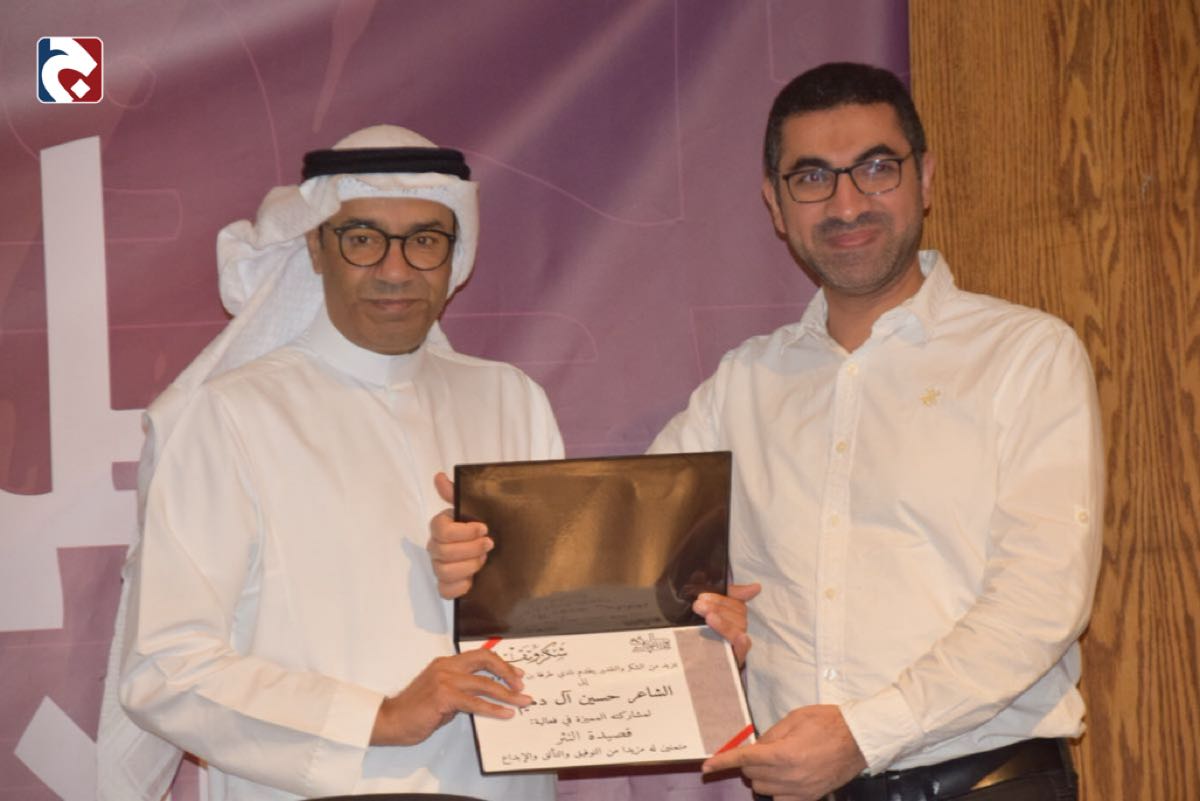 في ختام الأمسية، كرم رئيس نادي طرفة بن العبد الشاعر أحمد الماجد الشعراء المشاركين، تقديراً لإبداعاتهم وإثراءهم للمشهد الثقافي في القطيف.