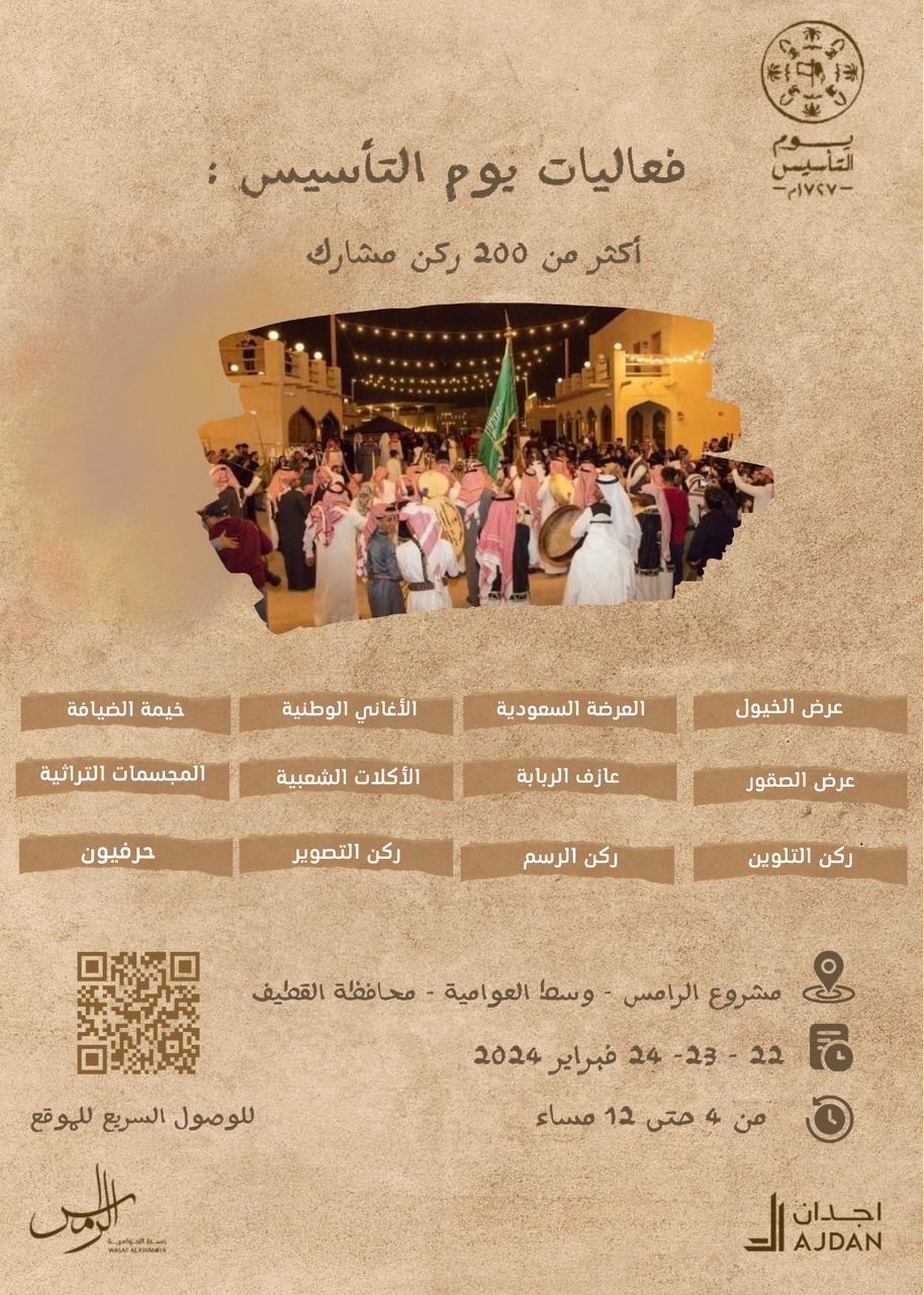 ودعا جميع أفراد المجتمع إلى المشاركة في فعاليات يوم التأسيس في مشروع الرامس بوسط العوامية، والاستمتاع بالفعاليات والعروض المتنوعة التي تقام في المشروع.