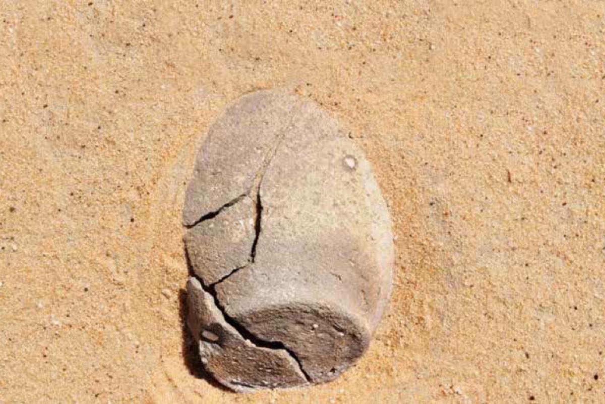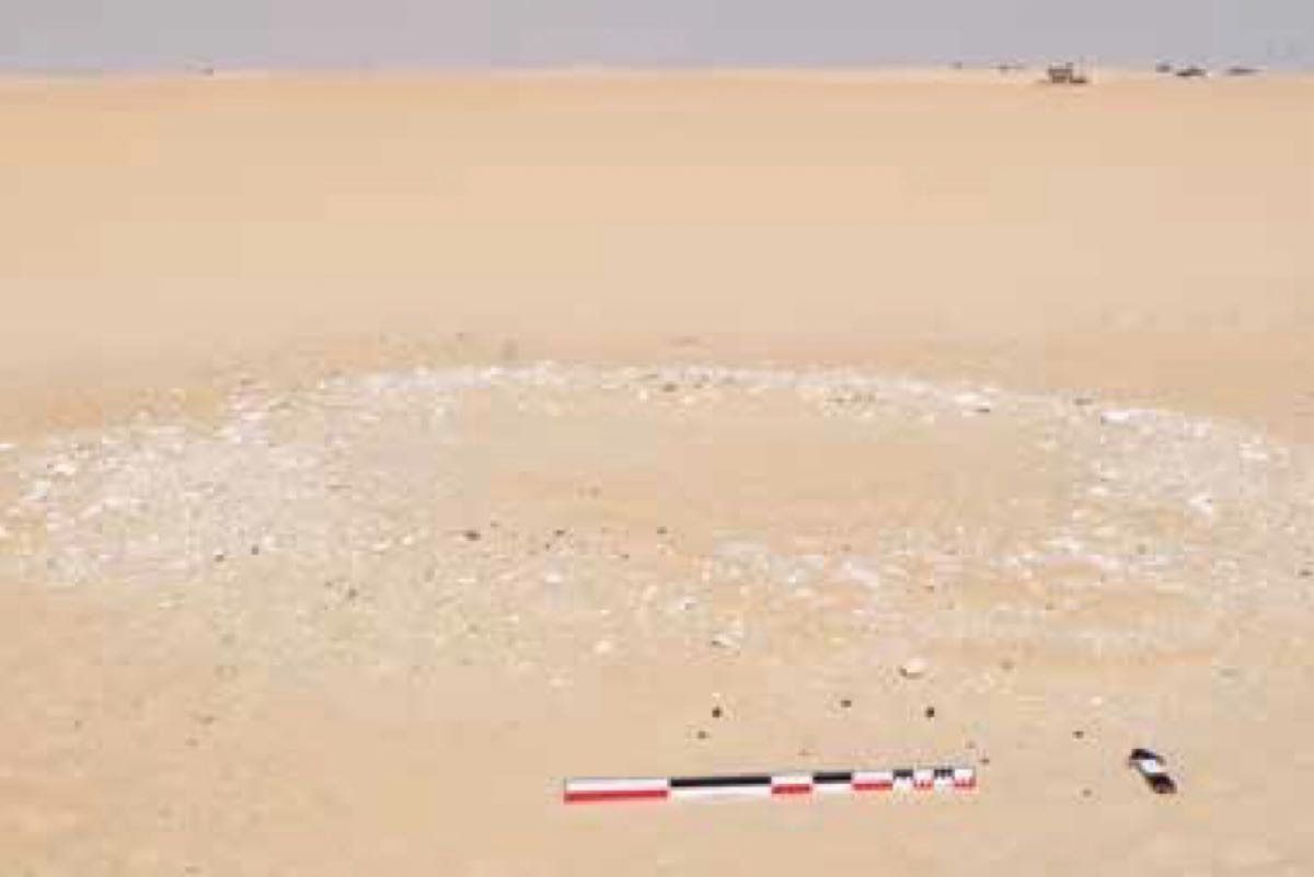 وحيث سجلت موقعاً أثرياً عبارة عن منطقة مرتفعة قليلاً تشكل هضبة تحيط بها الرمال، وتبرز على سطحها مجموعة احجار قد تشكل رجماً أو مدفناً ركامياً، أو بقايا بناء. وموقع آخر بين الكثبان الرملية، تنتشر على سطحه الأحجار من مختلف الأحجام، وقد تجمع بعضها مشكلاً عدداً من التلال البسيطة، والأحجار من نوع الفروش البحرية، وتلاحظ القواقع والأصداف البحرية الصغيرة المتحجرة ضمن مكوناتها، وربما كان الموقع قاعاً لمستنقع مياه، وقد التقطت من على سطحه مجموعة من كسر الفخار.