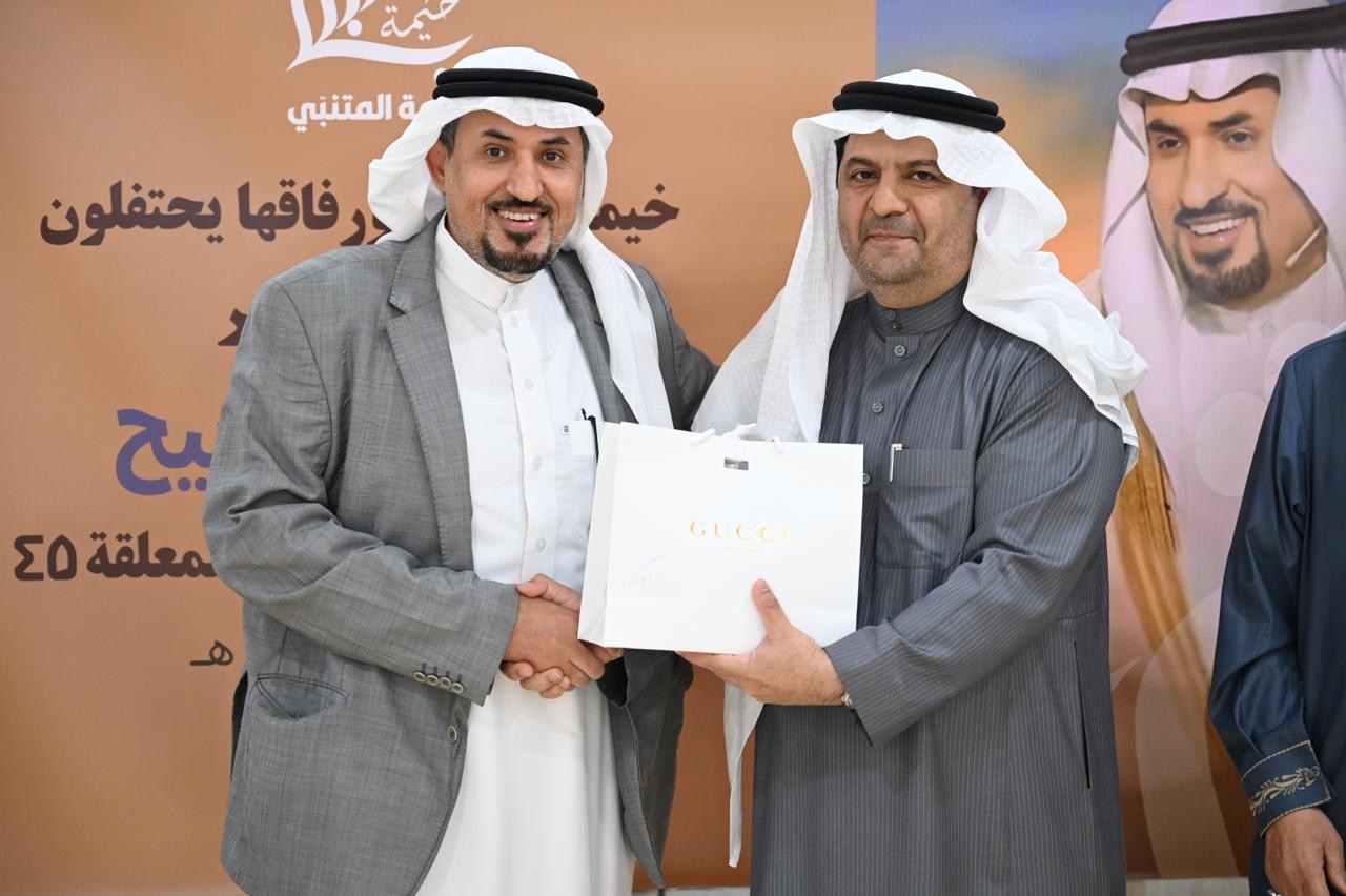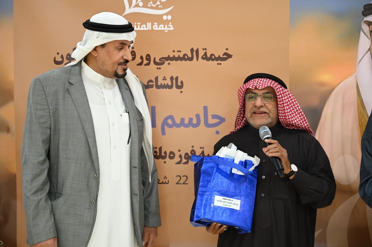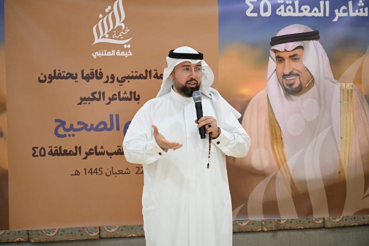 احتفت خيمة المتنبي ورفاقها بالشاعر جاسم الصحيح بمناسبة فوزه بلقب ”شاعر المعلقة“، وذلك مساء الأحد، بحضور لفيف من الشعراء والأدباء، وممثلين عن بعض منتديات وملتقيات المنطقة الشرقية.