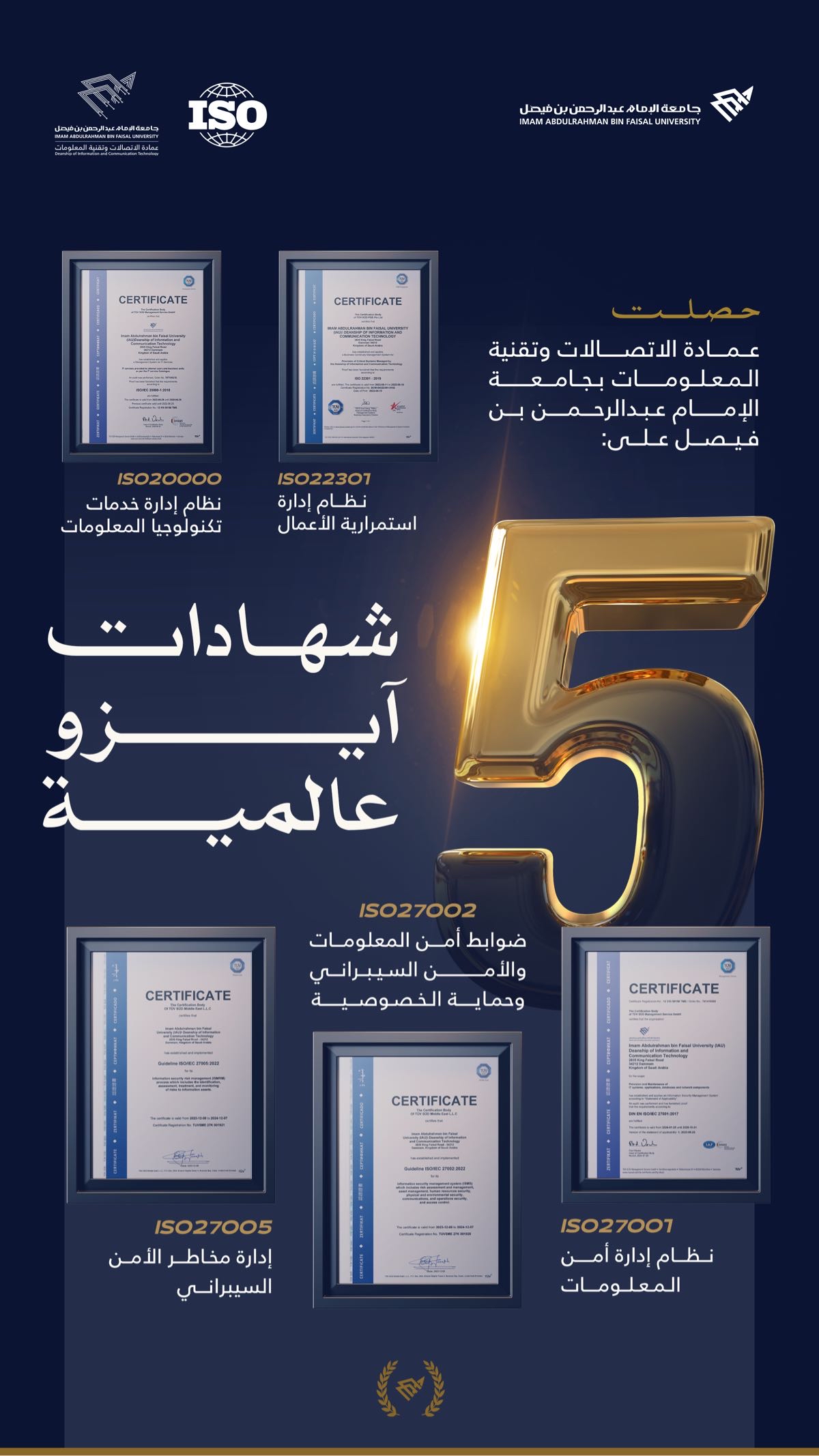 حصلت عمادة الاتصالات وتقنية المعلومات بجامعة الإمام عبد الرحمن بن فيصل، على 5 شهادات ”آيزو“ عالمية، في مجالات إدارة خدمات تقنية المعلومات، وأنظمة إدارة استمرارية الأعمال، وأنظمة إدارة أمن المعلومات وأفضل الممارسات في مجال أمن المعلومات، وفي إدارة مخاطر أمن المعلومات.