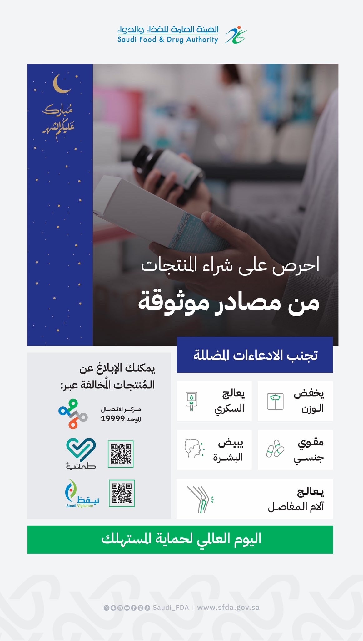 دعت الهيئة العامة للغذاء والدواء، المواطنين إلى الحرص على شراء المنتجات من مصادر موثوقة، وتجنّب الإدعاءات المضللة، والإبلاغ عن المنتجات المخالفة.