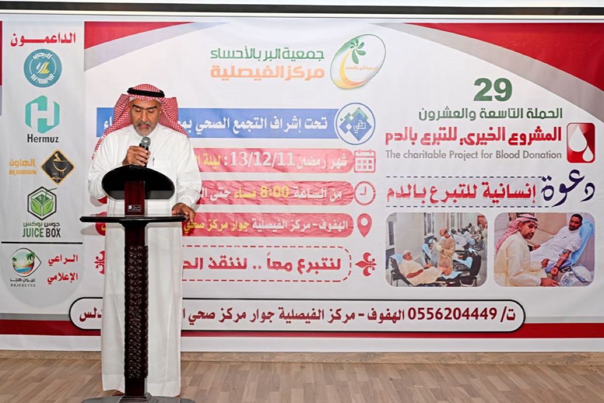استقبلت حملة التبرع بالدم 29 في مركز الفيصلية، التابع لجمعية البر بمحافظة الأحساء،108 متبرعين، تم قبول 91 شخصًا منهم، واستبعاد 17 لأسباب صحية، وذلك بإشراف تجمع الأحساء الصحي ممثلاً بالطاقم الطبي بمستشفى الملك فهد بالهفوف.