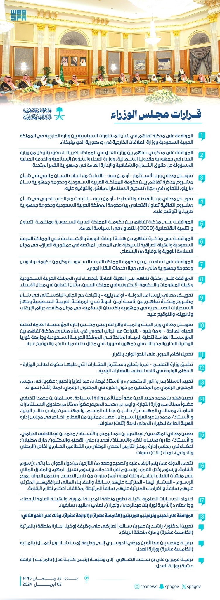 وأقر بالموافقة على مذكرتي تفاهم بين وزارة العدل في المملكة العربية السعودية وكل من وزارة العدل في جمهورية مقدونيا الشمالية، ووزارة العدل والشؤون الإسلامية والخدمة المدنية المسؤولة عن حقوق الإنسان والشفافية والإدارة العامة في جمهورية القمر المتحدة.