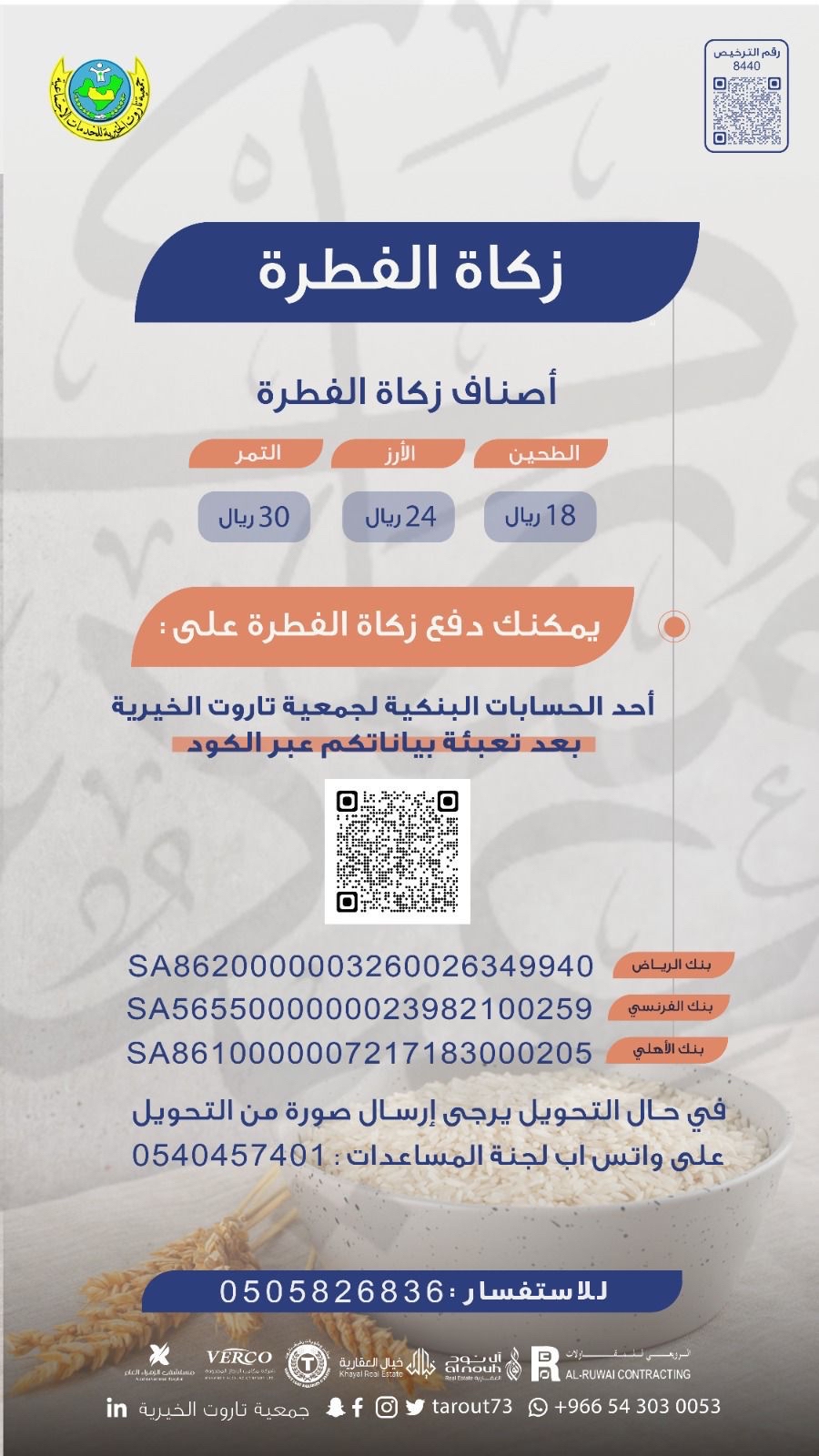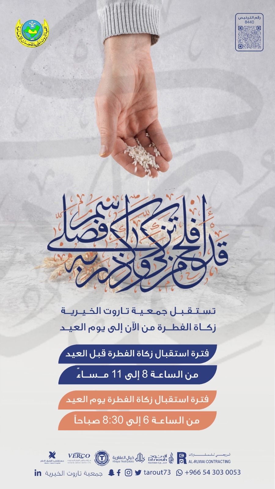 بدأت جمعية تاروت الخيرية، استقبال زكاة الفطرة، ابتداءً من يوم الثلاثاء 25 رمضان 1445ه وحتى نهاية الشهر الكريم.