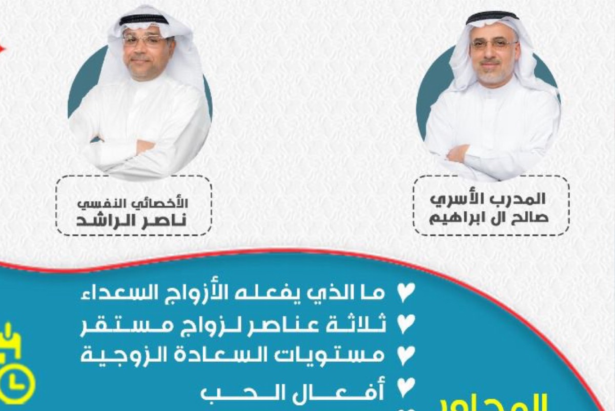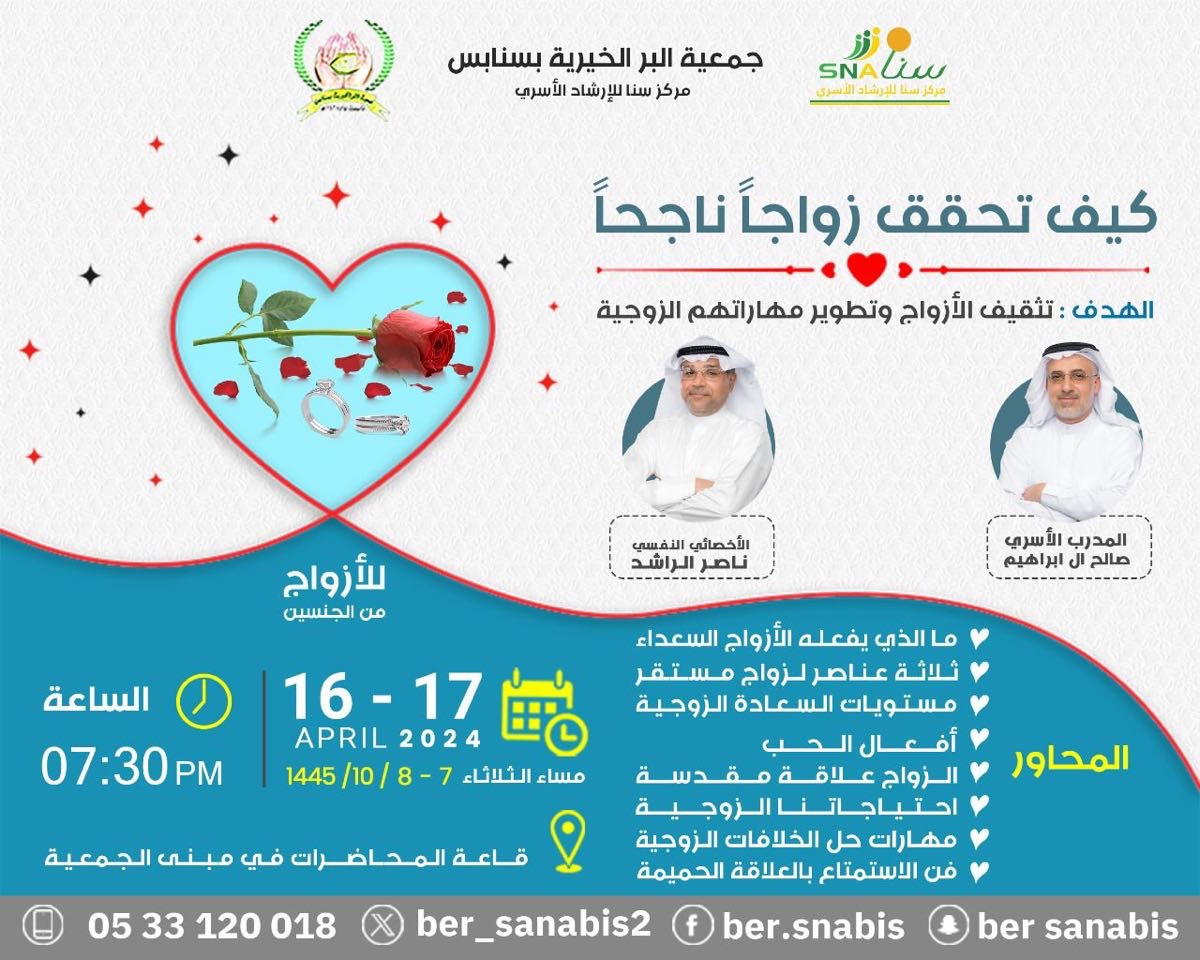 ينظم مركز سنا للإرشاد الأسري التابع لجمعية البر الخيرية بسنابس، البرنامج التثقيفي ”كيف تحقق زواجًا ناجحًا“.
