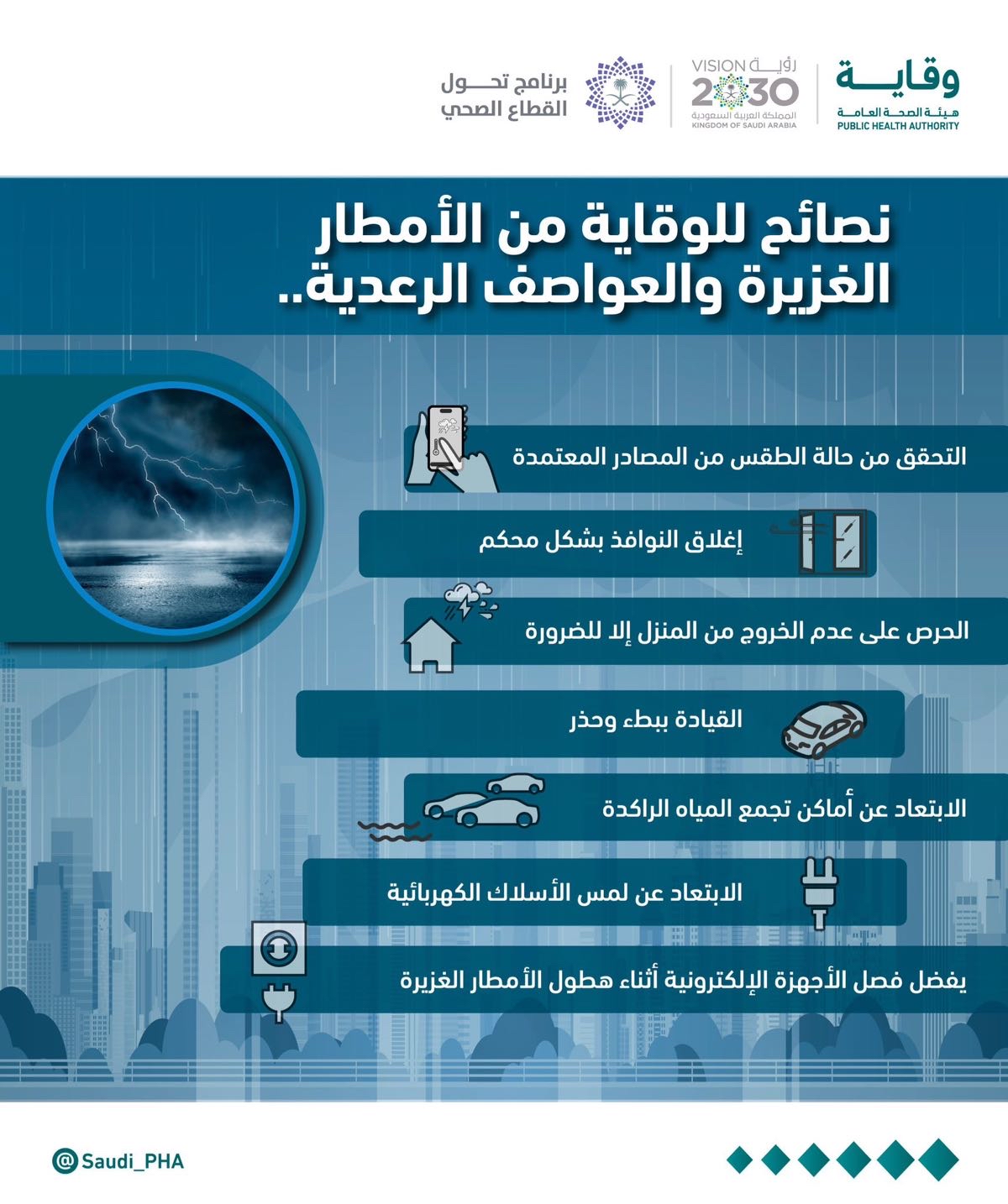 وجهت هيئة الصحة العامة ”وقاية“ 7 نصائح مهمة للمواطنين أثناء هطول الأمطار الرعدية والعواصف، والرياح الشديدة، للحفاظ على السلامة العامة.
