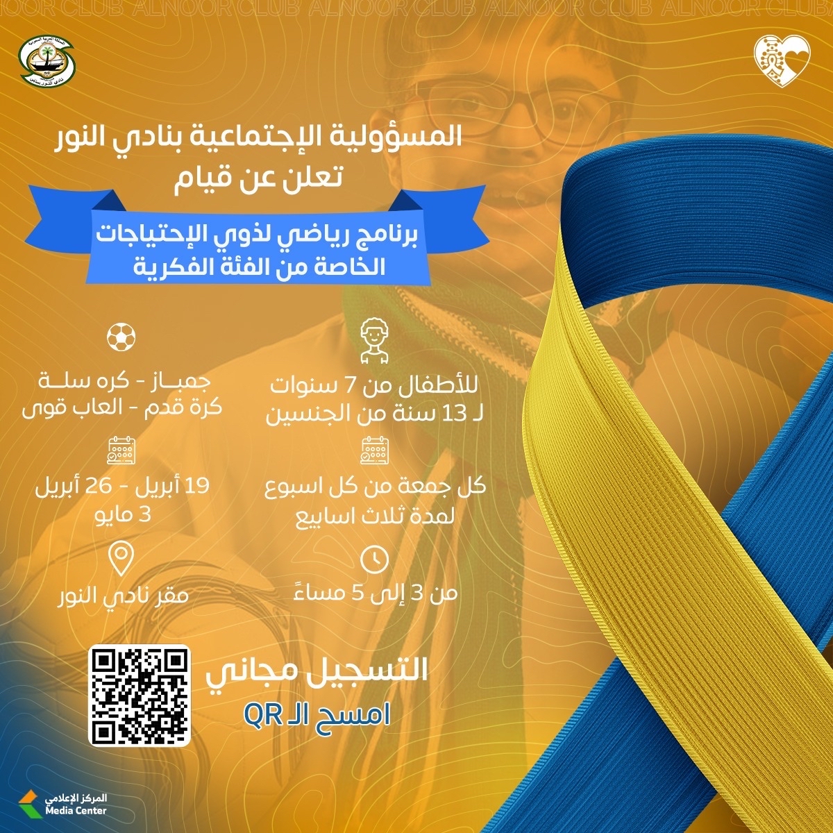 تقيم إدارة المسؤولية الاجتماعية بنادي النور، برنامجًا رياضيًا لذوي الاحتياجات الخاصة من الفئة الفكرية، كل جمعة، لمدة ثلاثة أسابيع، من الساعة الثالثة حتى الخامسة عصرًا في مقر النادي.