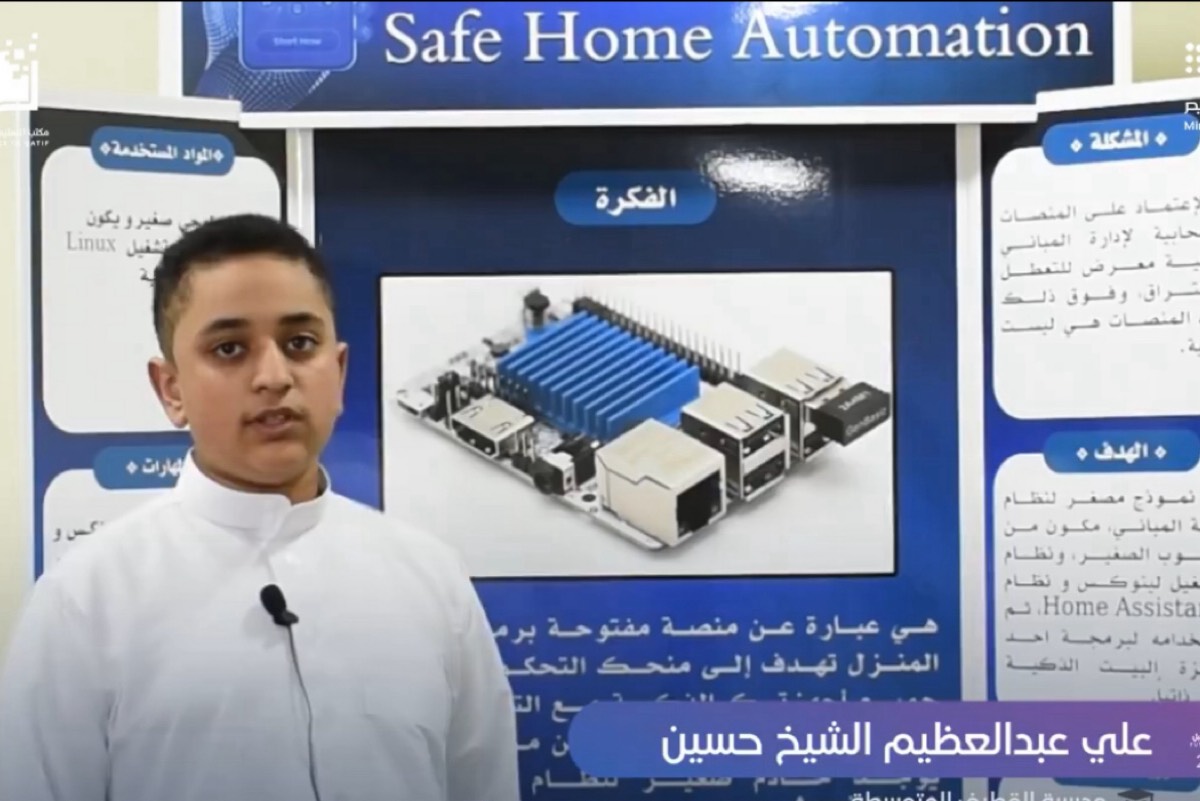 استعرض الطالب ”علي عبد العظيم الشيخ حسين“، من مدرسة القطيف المتوسطة بمحافظة القطيف، مشروعه في مجال نظم البرمجيات، والذي جاء بعنوان ”المنزل الذكي الآمن“.