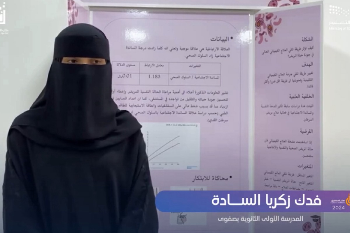 استعرضت الطالبة ”فدك زكريا السادة“، من المدرسة الأولى الثانوية بصفوى بمحافظة القطيف، مشروعها في مجال الطب التقني والذي جاء بعنوان ”من أجل حياة أفضل مع العلاج الكيميائي“، وذلك ضمن المشاريع المشاركة في أولمبياد البحث العلمي والابتكار الثامن بالقطيف 2024، والذي ينظمه مكتب التعليم بمحافظة القطيف.