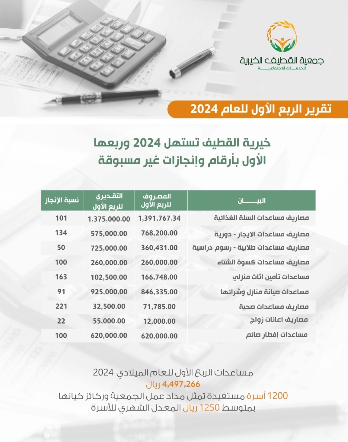 بلغ إجمالي المساعدات التي قدّمتها جمعية القطيف الخيرية، خلال الربع الأول للعام الجاري 2024 م، ما مجموعه 4,497,266 ريال، مثلت 24 % من الميزانية المقرَّة للعام.