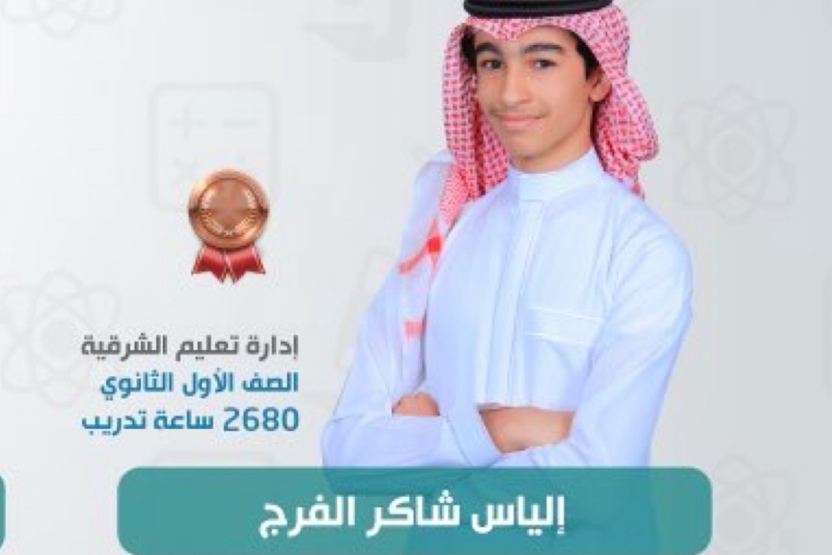وفاز بمدالية برونزية الطالب إلياس شاكر الفرج إدارة تعليم الشرقية الصف الأول الثانوي، والذي حصل 2680 ساعة تدريب.