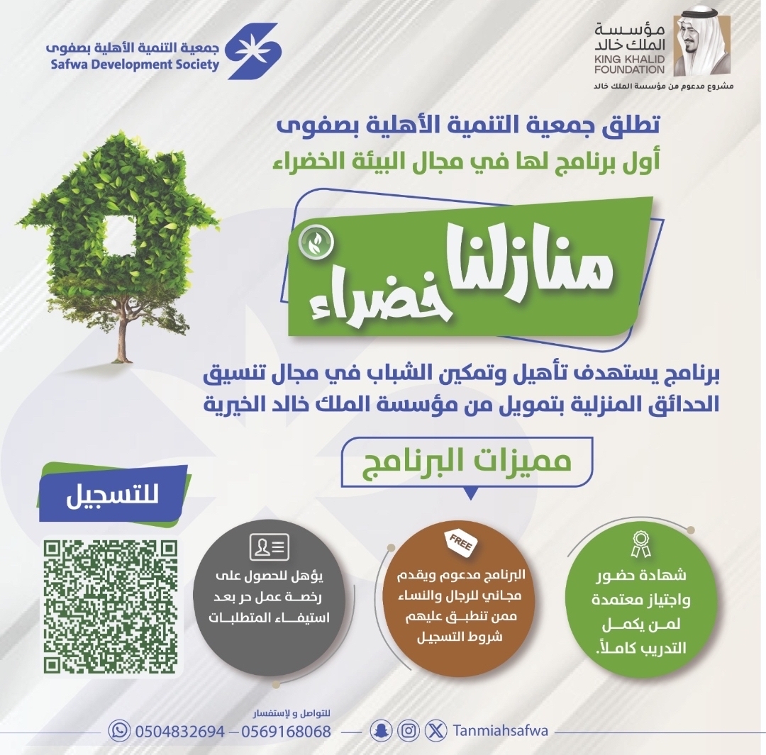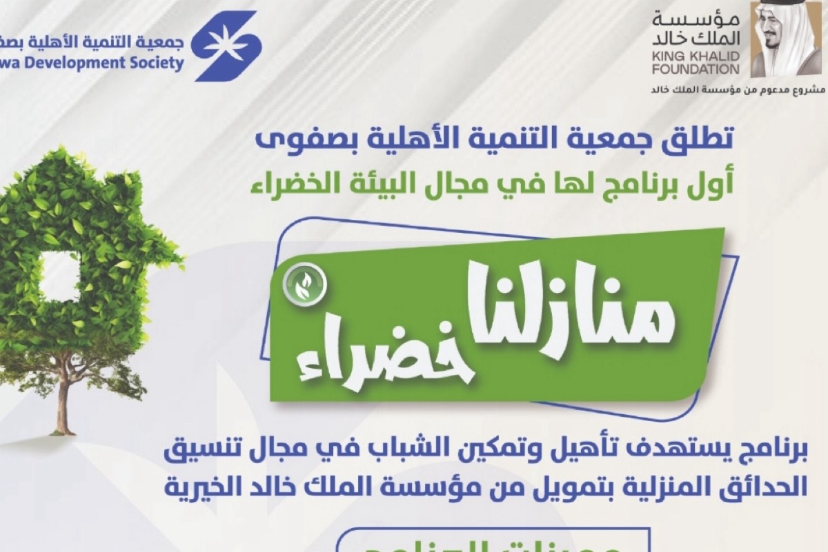 يهدف برنامج ”منازلنا خضراء“، الذي تقيمه جمعية التنمية الأهلية بصفوى، إلى تأهيل شباب وشابات المنطقة العاطلين عن العمل في مجال تنسيق الحدائق، عبر إلحاقهم في دورات تدريبية في مجالات ”تنسيق الحدائق المنزلية، نظم الري الحديثة، مهارات التسويق الفعّال، وأخلاقيات العمل“.