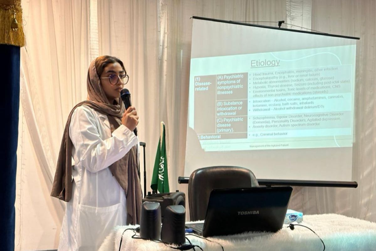 وتحدثت الدكتورة ملك الزواد في عدة محاور أساسية، منها تعاريف الهياج والعنف، الأسباب المرضية والسلوكية، نهج التعامل مع الهياج، طرق خفض التصعيد، إضافةً إلى التقييد البدني والكيميائي.