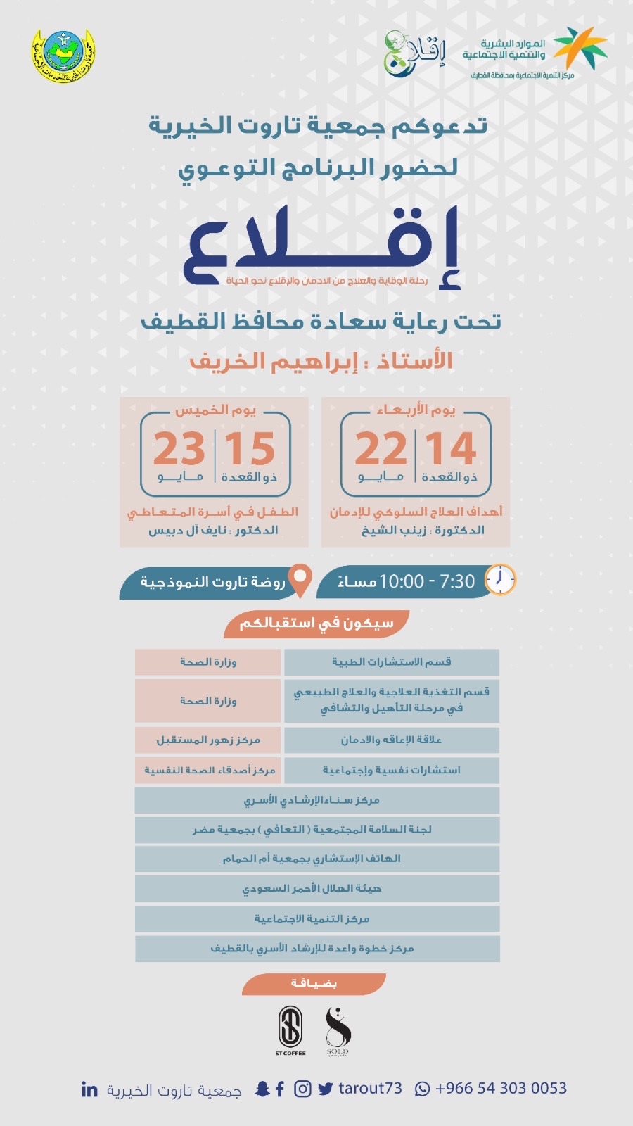 تحت عنوان ”الإقلاع نحو الحياة“، تنظم جمعية تاروت الخيرية، برنامج ”إقلاع“، الذي أطلقه مركز التنمية الاجتماعية، برعاية محافظ القطيف إبراهيم الخريف؛ بهدف التوعية للوقاية والعلاج من الإدمان، وذلك في مقر روضة تاروت النموذجية، يومي الأربعاء والخميس 22-23 مايو الجاري.