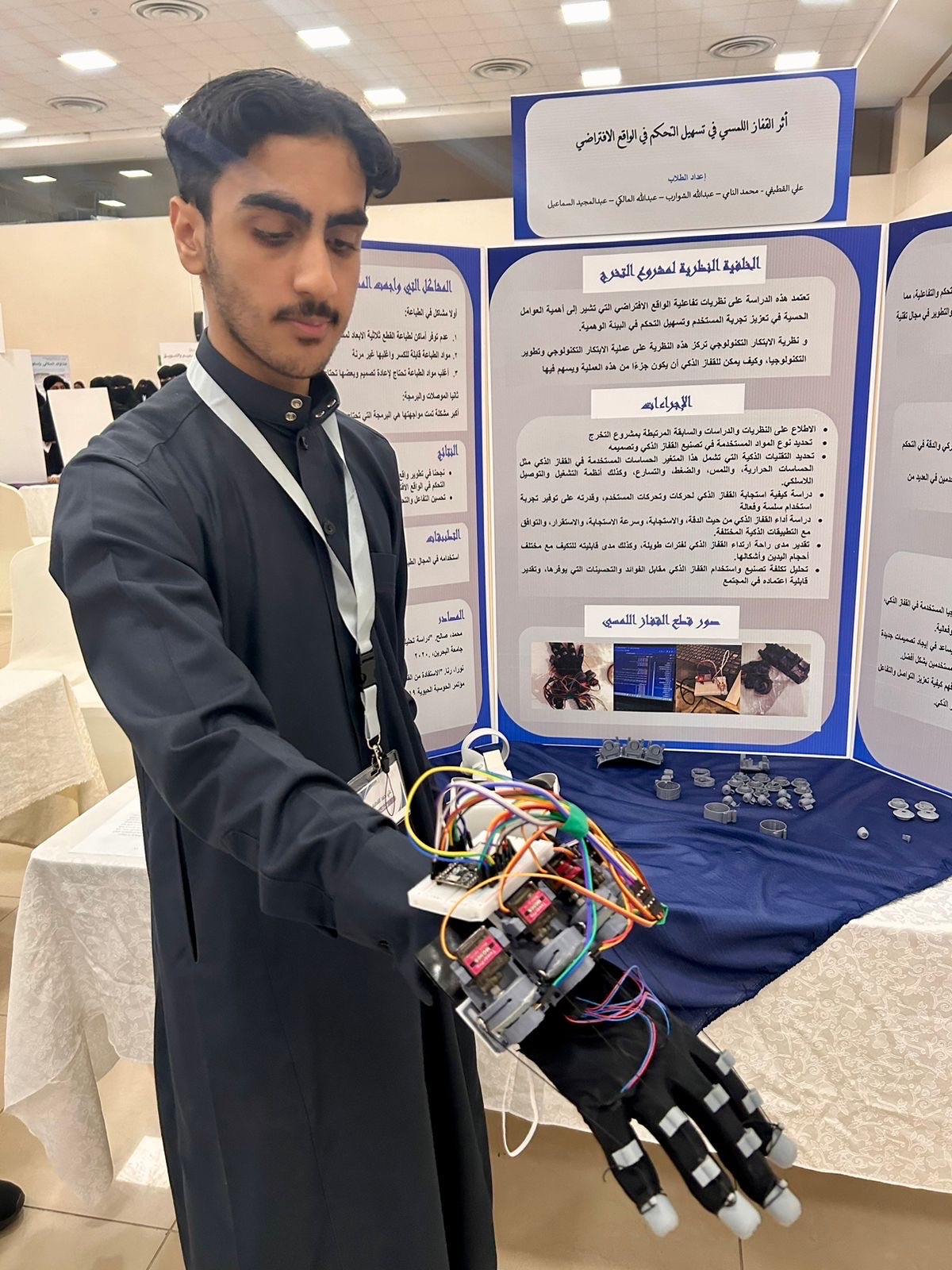 واستمع الضيوف إلى شرح من الطلاب والطالبات عن مشاريعهم البحثية، التي تنوعت بين العلمية والاقتصادية والإدارية والبيئية والصحية، ومن ذلك مشروع أثر القفاز اللمسي في تسهيل التحكم في الواقع الافتراضي، والذي عمل عليه الطلاب ”علي القطيفي، ومحمد النامي، وعبدالله الشوارب، وعبدالله المالكي، وعبدالمجيد السماعيل“.