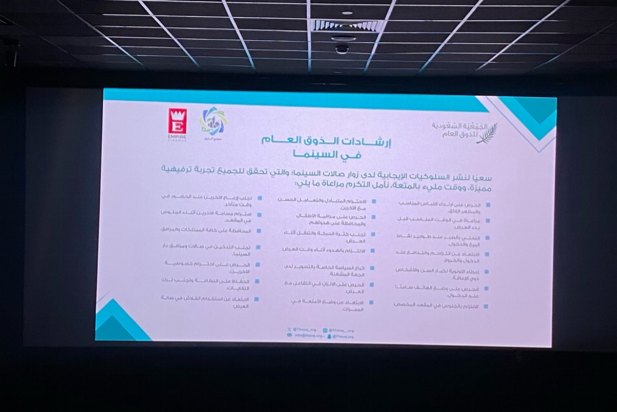 أطلقت الجمعية السعودية للذوق العام بالتعاون مع شركات السينما بالمنطقة الشرقية، برنامج ”السينما والمسرح“ والدي يهدف إلى تعزيز السلوكيات الإيجابية لدى مرتادي صالات السينما.