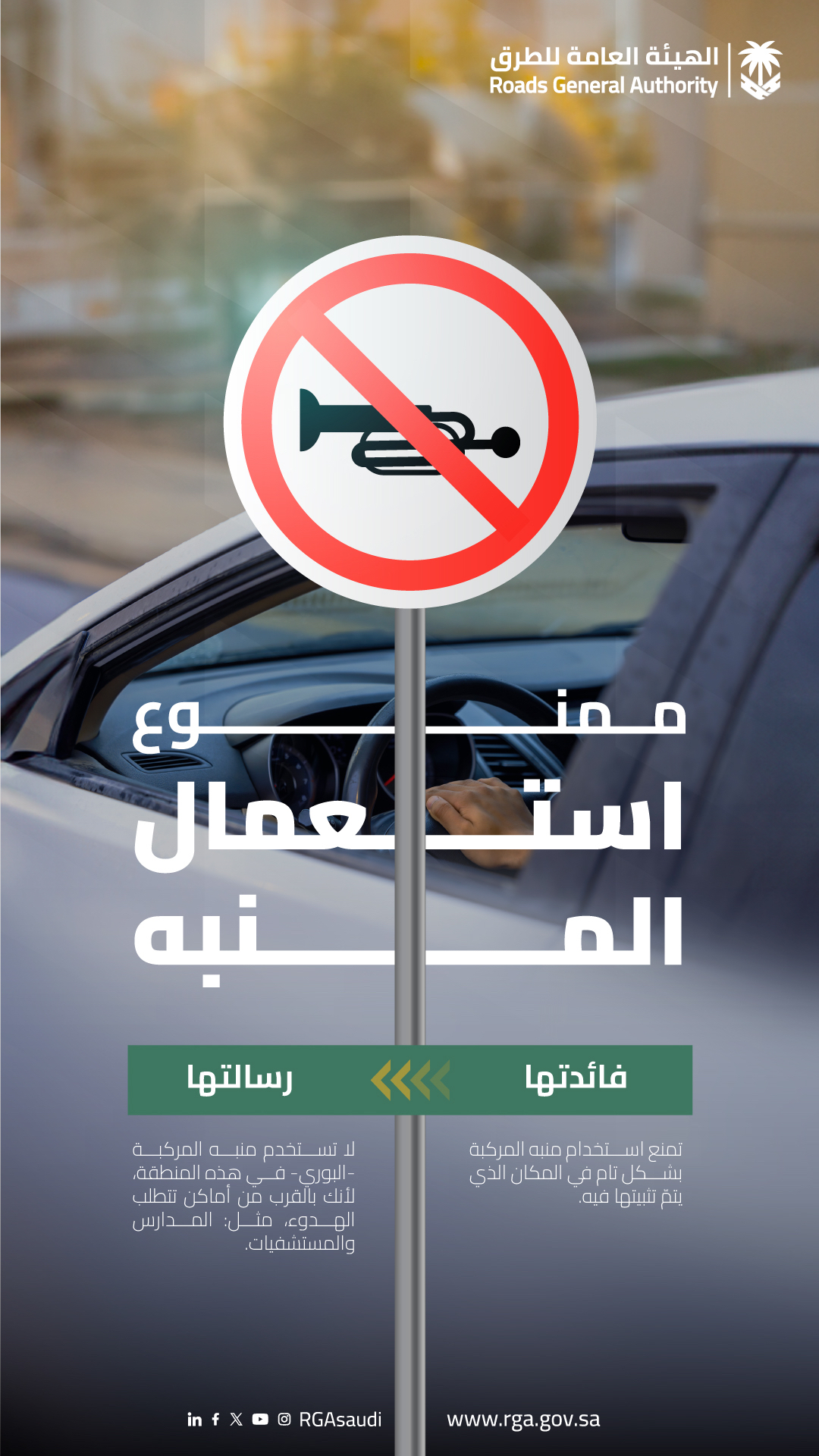 دعت الهيئة العامة للطرق قائدي المركبات إلى مراعاة الهدوء والسكينة عند القيادة بالقرب من الأماكن التي تتطلب ذلك، مثل المدارس والمستشفيات، والامتناع عن استخدام المنبه إلا للضرورة القصوى.