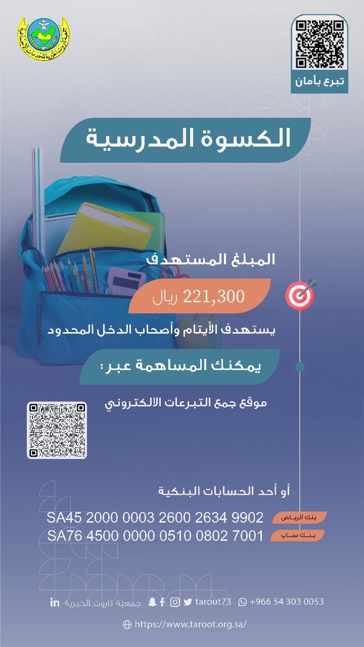 مع اقتراب العام الدراسي الجديد 1446 هـ، أطلقت جمعية تاروت الخيرية مشروع ”الحقيبة المدرسية“ الهادف إلى مساعدة الطلاب من الأسر المستفيدة والأسر المتعففة في المنطقة.
