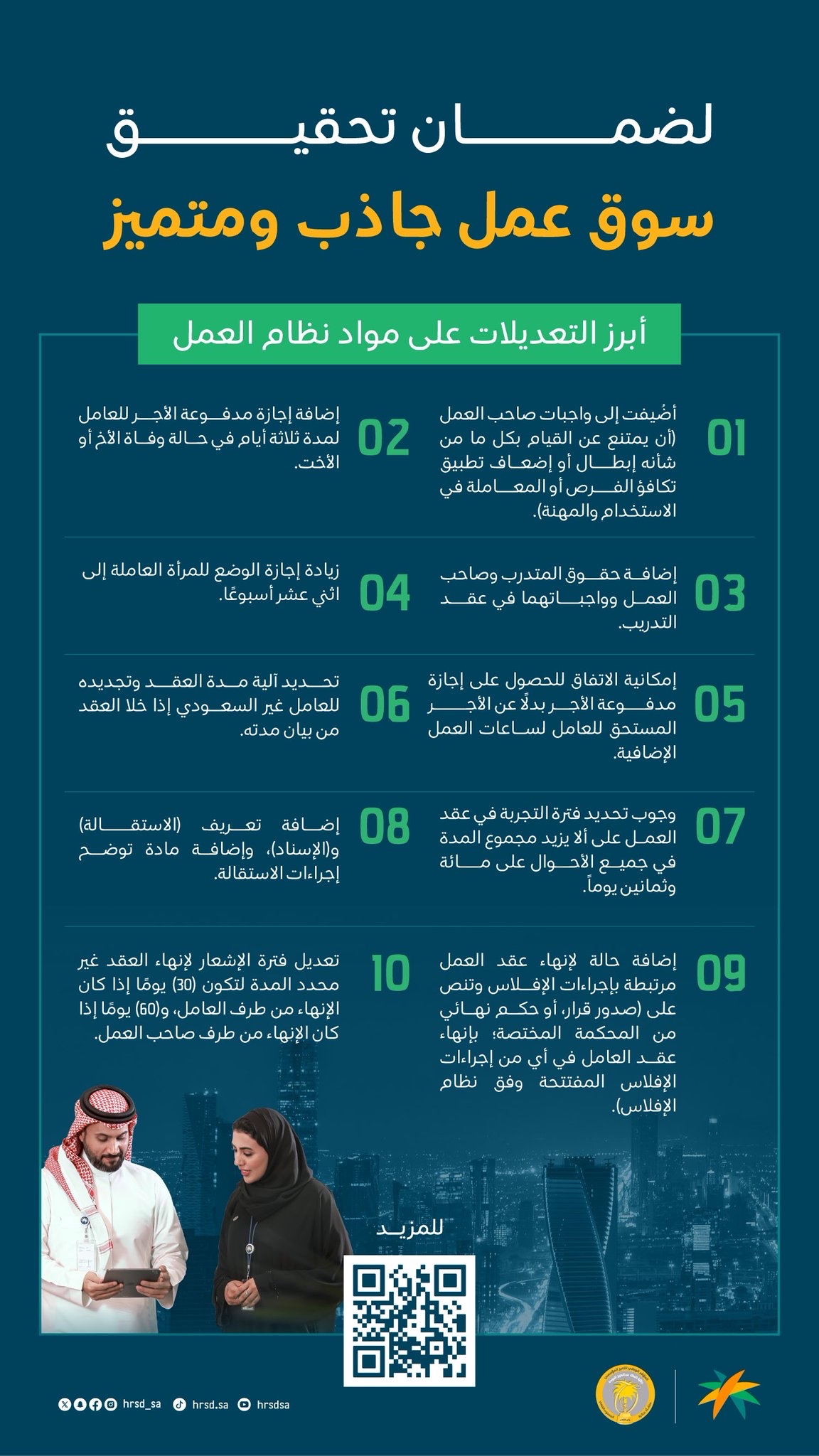 وتهدف التعديلات إلى تحسين سوق العمل في المملكة وتعزيز الاستقرار الوظيفي، وحفظ حقوق أطراف العلاقة التعاقدية، إضافةً إلى تطوير الكوادر البشرية وتعزيز فرص تدريب العاملين وزيادة فرص العمل للمواطنين.