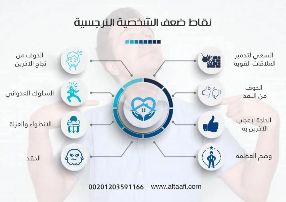 يعاني النرجسي من فرط الحساسية تجاه آراء الآخرين وعدم تقبلها والسخرية منها، ويعتقد أنه فريد متميز عن غيره، إذ يمتلك شعورا متضخما بأهميته ويستحوذ عليه وهم النجاح والتألق والانشغال في المبالغة بإنجازاته.