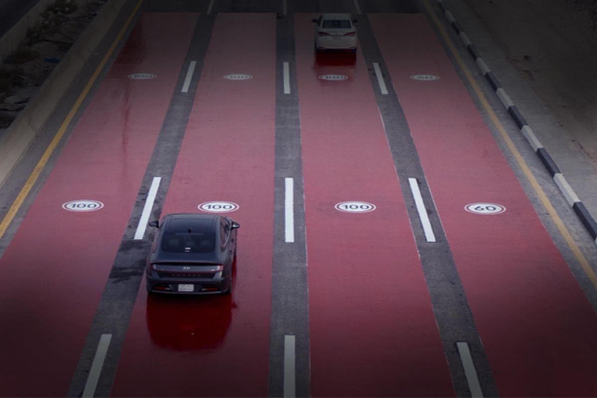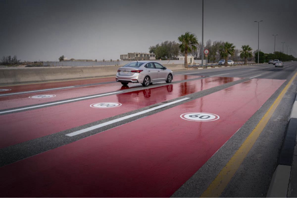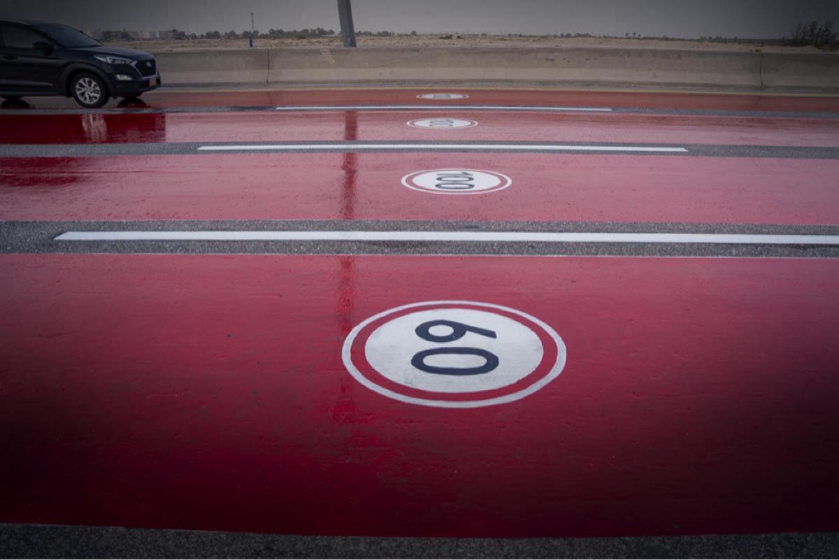 يُذكر أن الموقع المُحدد بهذه الخاصية في الطريق يتشكل من مجموعة من عناصر السلامة والعلامات المرورية الأرضية ويتضمن ذلك علامات مسبقة الصنع لـ ”حد السرعة الجديدة“، مسار دهان أحمر بارد ثنائي المُكون.