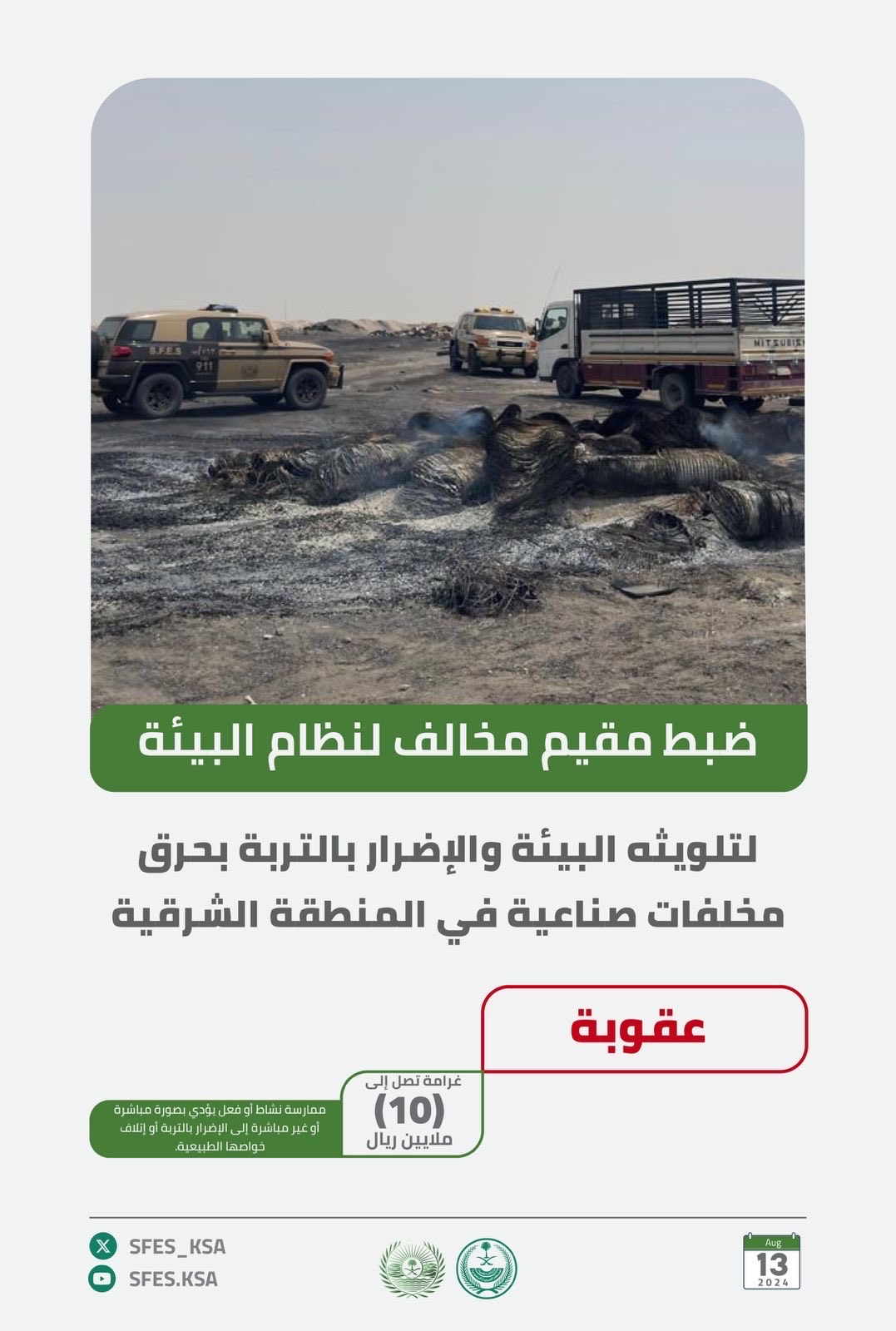 تمكنت القوات الخاصة للأمن البيئي من ضبط مقيم مخالف لنظام البيئة لتسببه في تلويث البيئة والإضرار بالتربة عن طريق حرق مخلفات صناعية في المنطقة الشرقية.