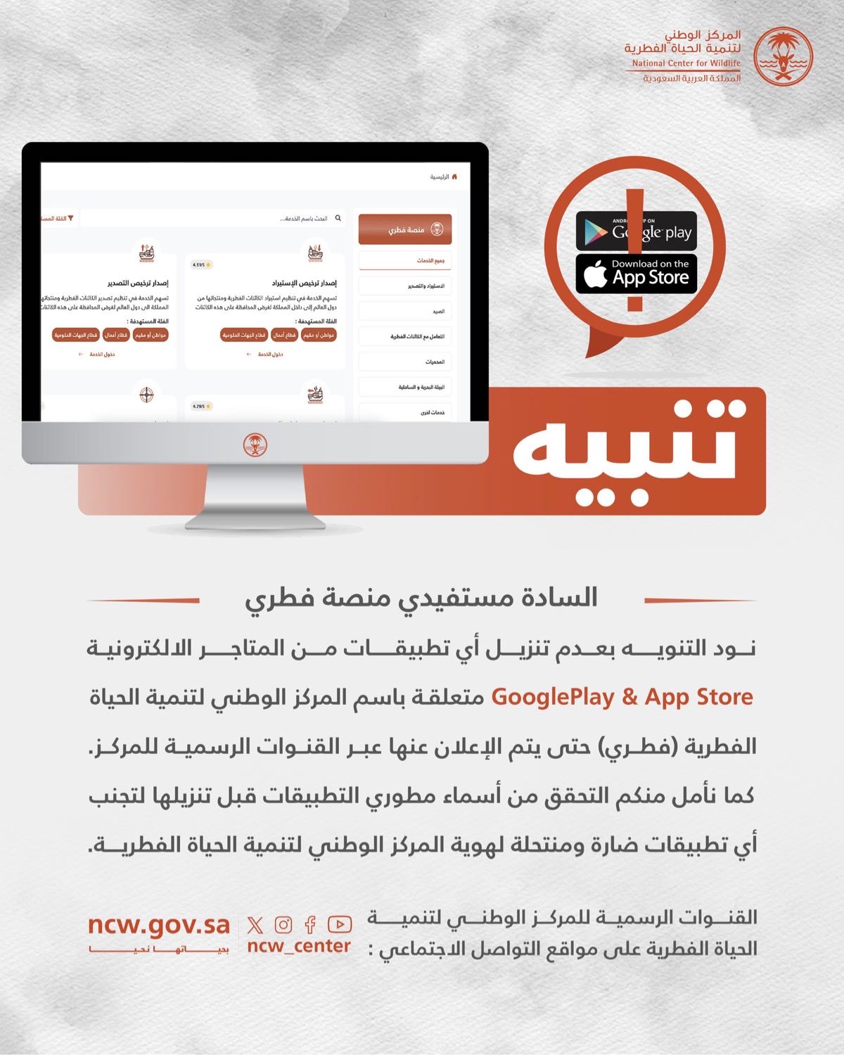 حذّر المركز الوطني لتنمية الحياة الفطرية في المملكة العربية السعودية ”فطري“ مستخدمي الهواتف الذكية من تنزيل أي تطبيقات متوفرة على متجري ”غوغل بلاي“ و”آب ستور“ تدّعي ارتباطها بالمركز.