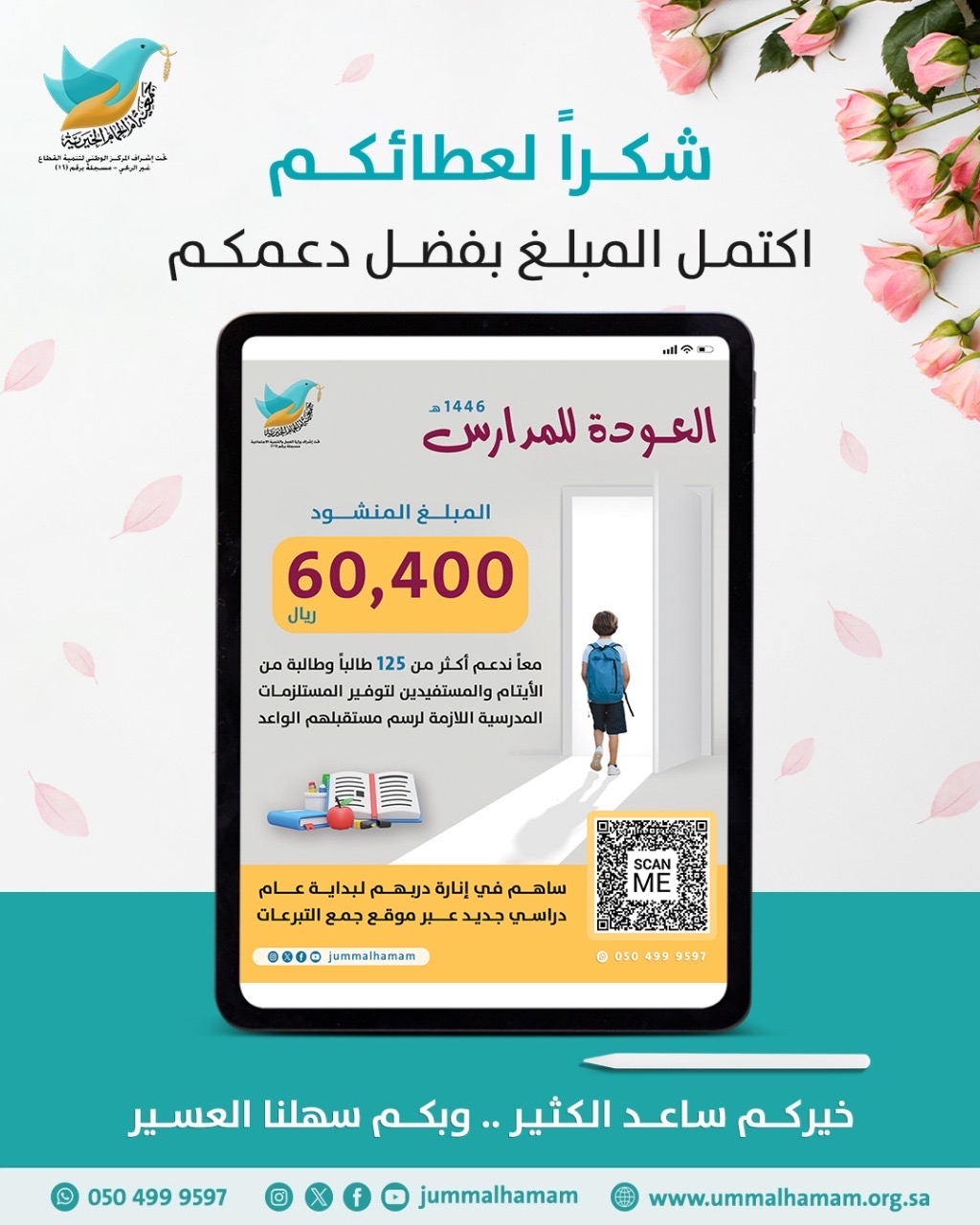 حققت جمعية ”أم الحمام الخيرية“ نجاحاً في حملتها الأخيرة ”العودة إلى المدارس“، حيث تمكنت من جمع المبلغ المستهدف وهو 60,400 ريال.