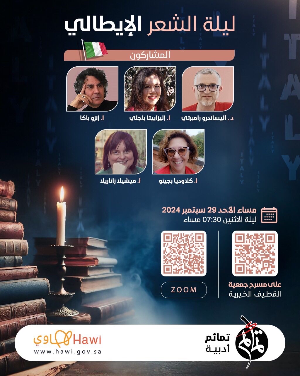 في أمسية شعرية فريدة، استضاف نادي ”تمائم أدبية“ فعالية ”ليلة الشعر الإيطالي“، حيث اجتمع نخبة من الشعراء الإيطاليين والعرب في لقاء ثقافي فريد من نوعه.