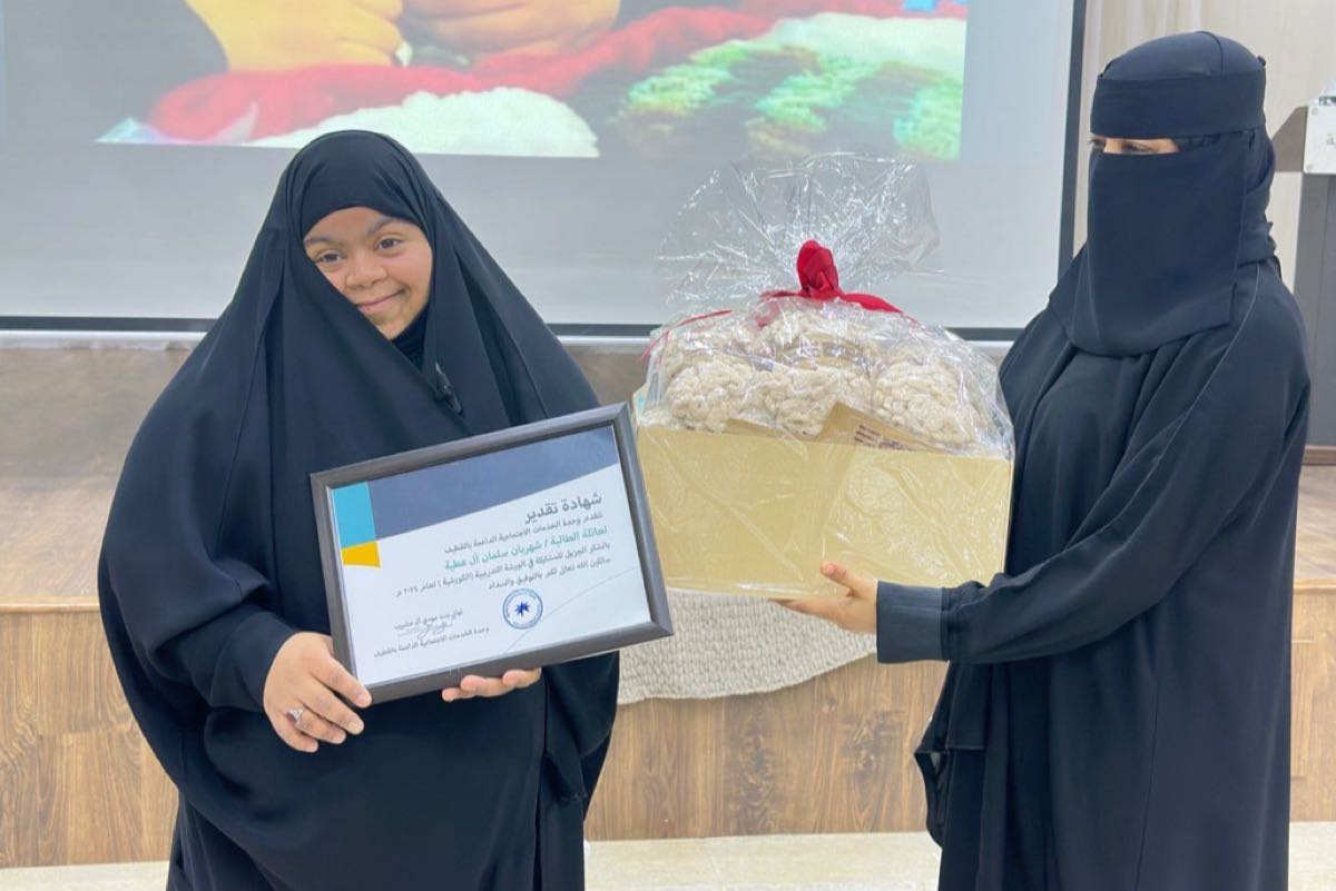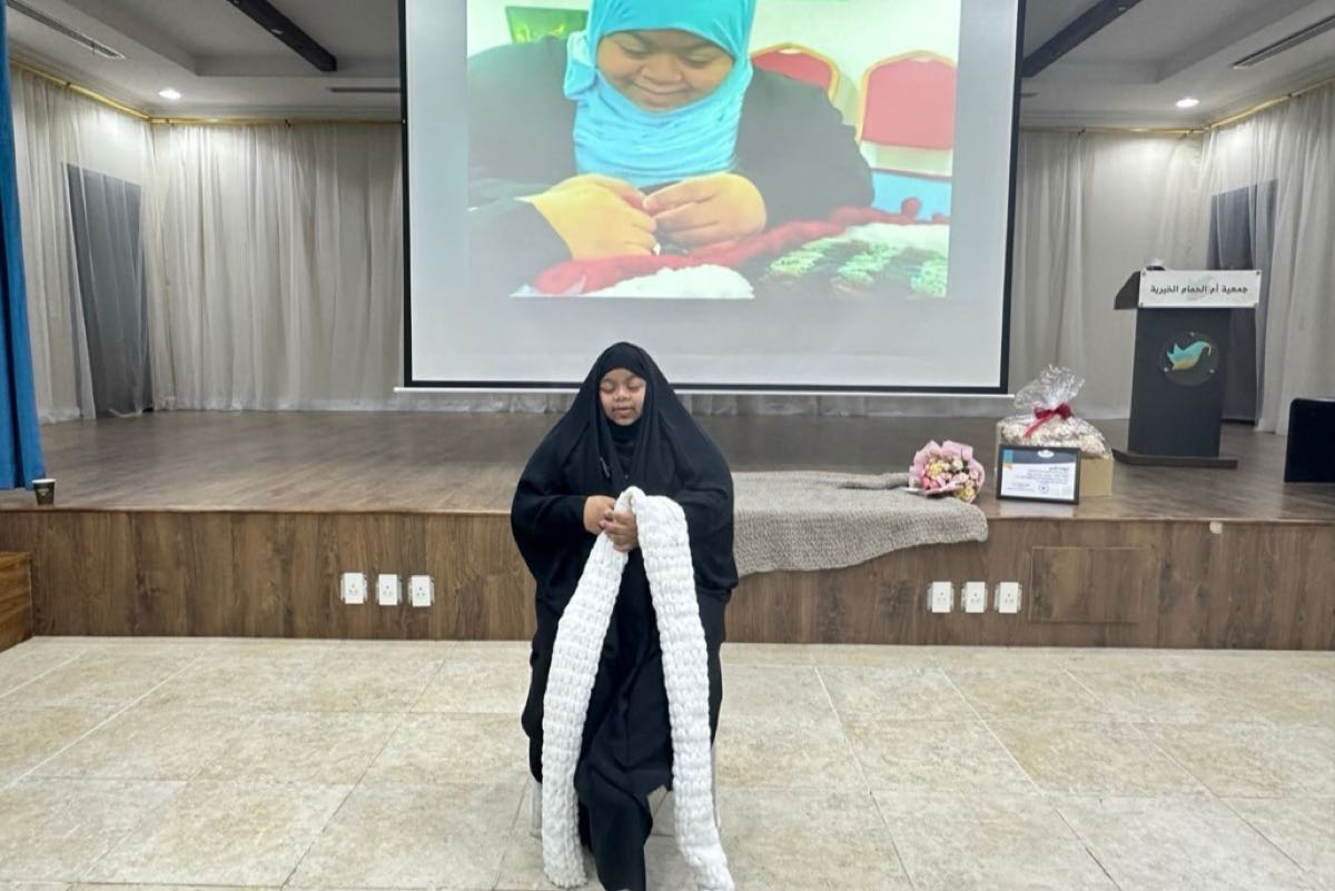 وقدمت الورشة ”شهربان سلمان آل عطيّة“، من ذوي الإعاقة ”متلازمة داون“، بمساعدة شقيقتها حميدة، بمشاركة أكثر من 20 سيدة وفتاة.